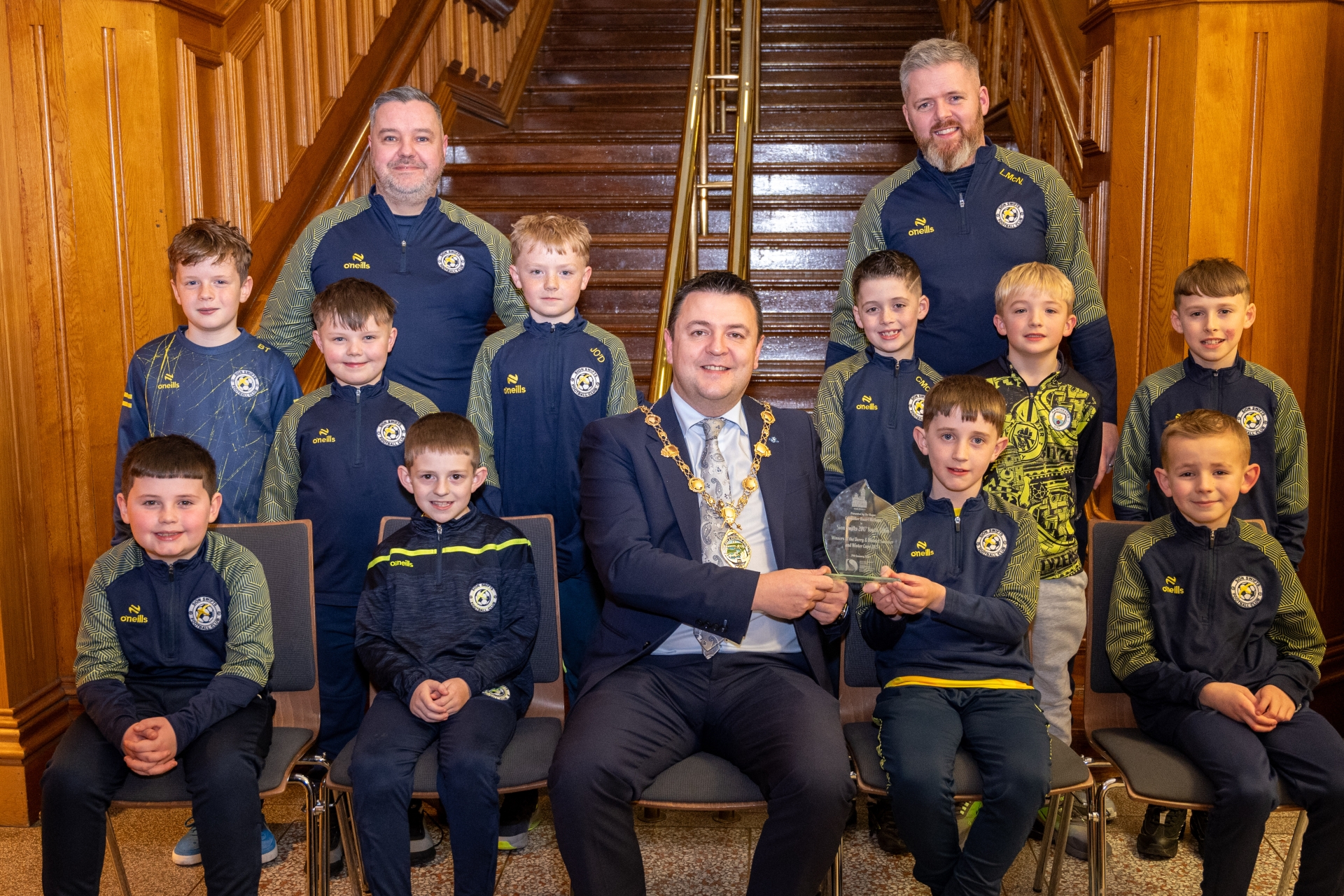 The Mayor Councillor Ruairi welcomed the 2017 year group of young footballers from Sion Swifts to the Guildhall where he presented a commemorative piece of crystal to Captain Eamonn Gallen. Included are his teammates and coaches, Barry McGuigan and Liam McNamee.
