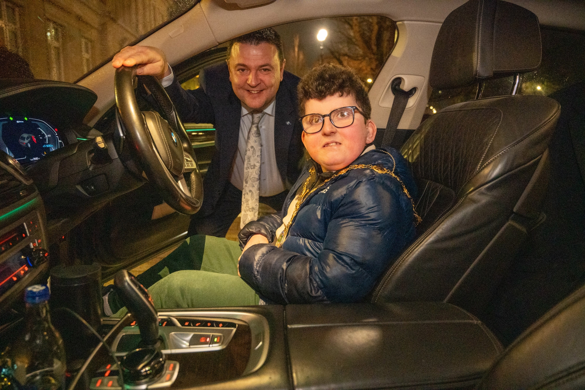 Car enthusiast John O'Connor receives a guided tour of the Mayoral car from the Mayor Councillor Ruairi McHugh during a visit by Sion Swifts Youth Team at the Guildhall. (Photos: Martin McKeown)