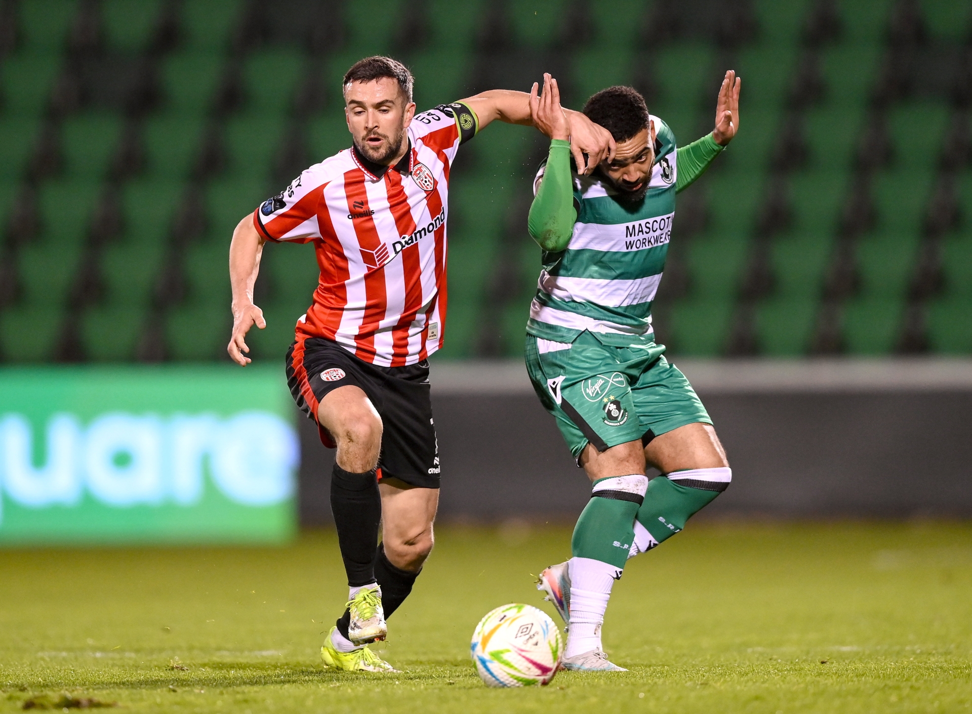 Derry captain Michael Duffy holds off Jake Mulraney of Shamrock Rovers. (Photo: Stephen McCarthy/Sportsfile)