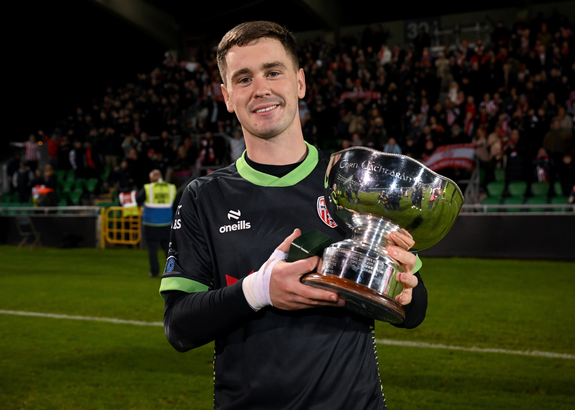 Goalkeeper Brian Maher poses with the FAI President's Cup after victory at Tallaght Stadium. (Photo: Stephen McCarthy/Sportsfile)