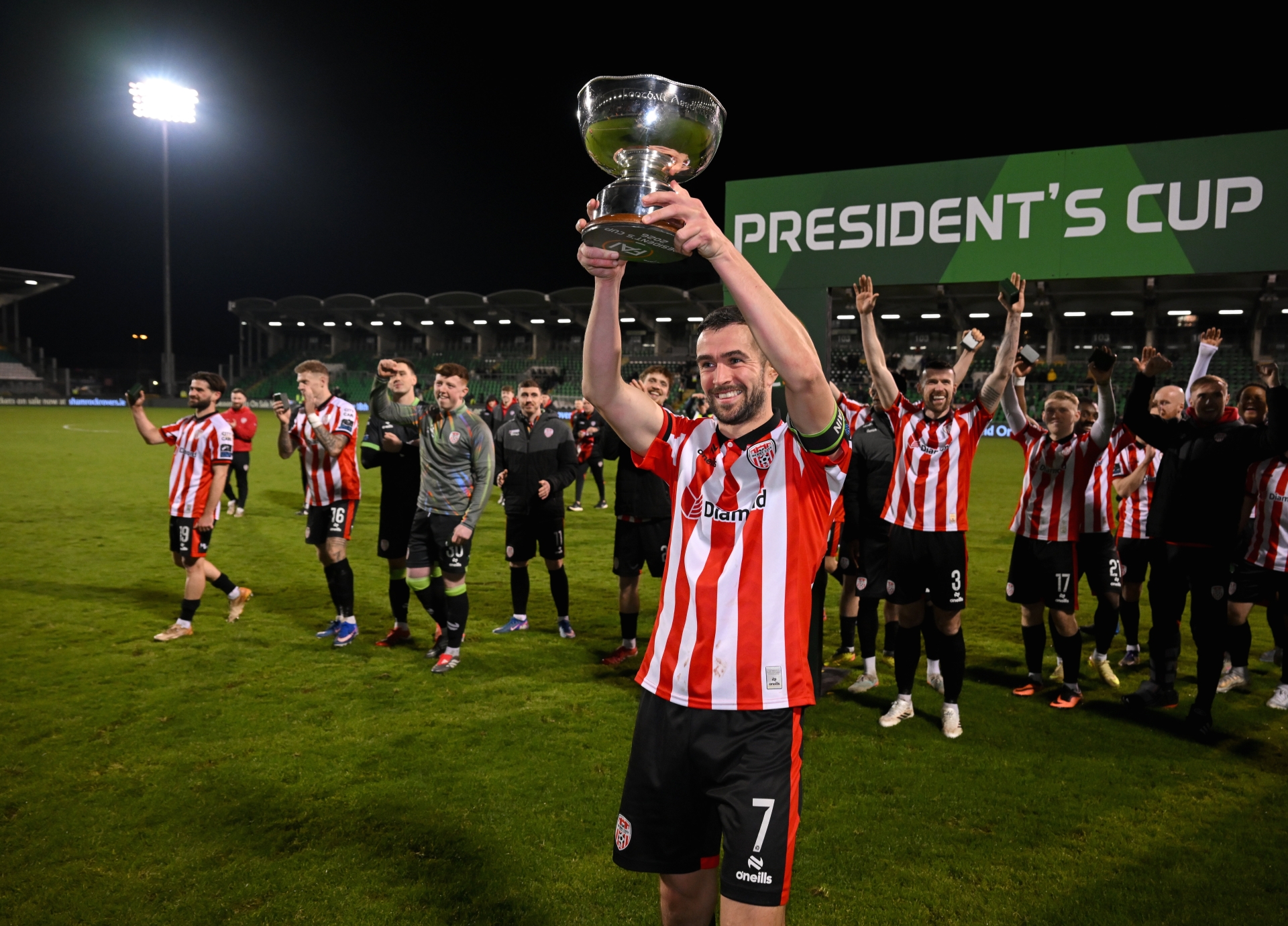 Derry City captain Michael Duffy poses with the FAI President's Cup after the 2026 Men's President's Cup final match. (Photo: Stephen McCarthy/Sportsfile)