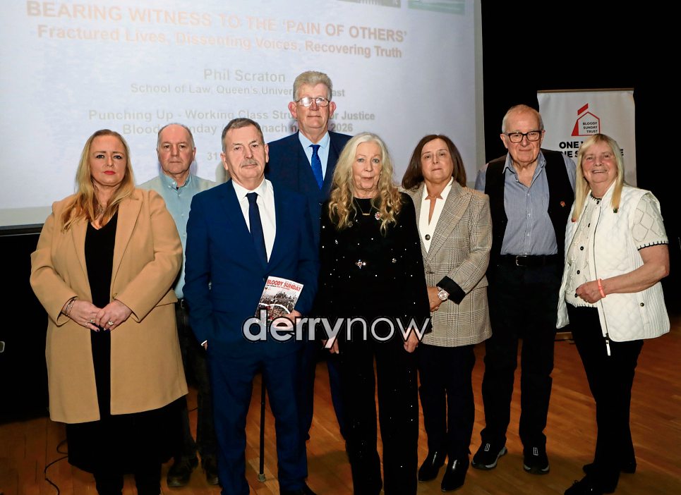Members of the panel who took part in the Bloody Sunday Trust weekend event, “Punching Up: Working Class Struggles for Justice” held in the Millennium Forum. From left, are Donna Harper (Creeslough), Tony Doherty (Bloody Sunday), (Ballymurphy), Jon McCourt (Survivors N-W), Antoinette Keegan (Stardust), Deirdre Connolly (Post Office Scandal), Professor Phil Stratton (criminologist), and Margaret Aspinall (Hillsborough). (Photos - Tom Heaney, nwpresspics)