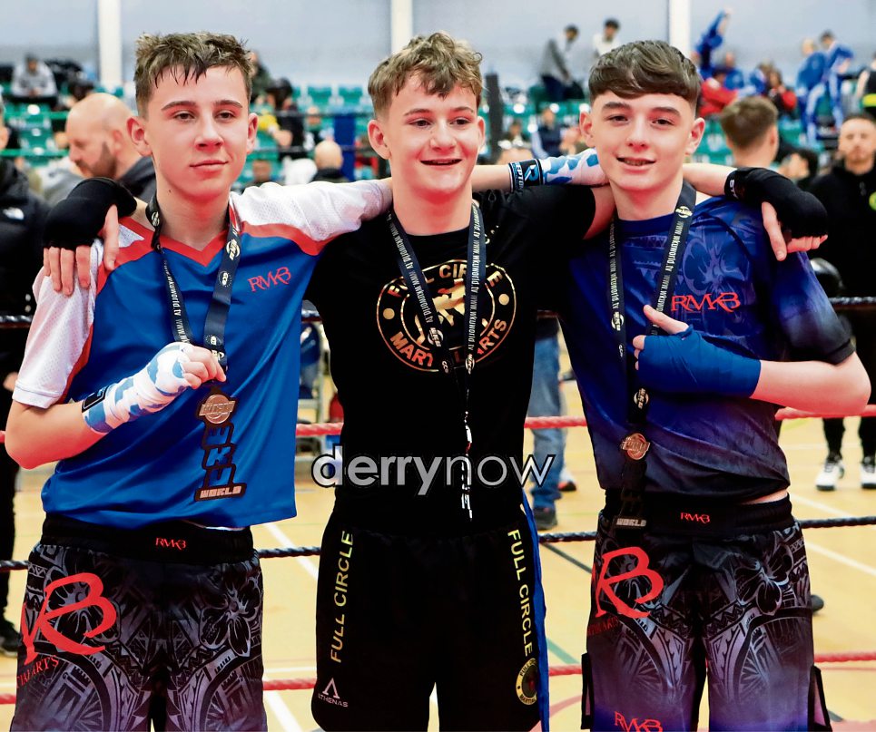 Conor Mailey, 1st place, with Filip Matyszkiewicz, 2nd place and Harry Blair 3rd place in the KL17 Kick Light 13-14 years.