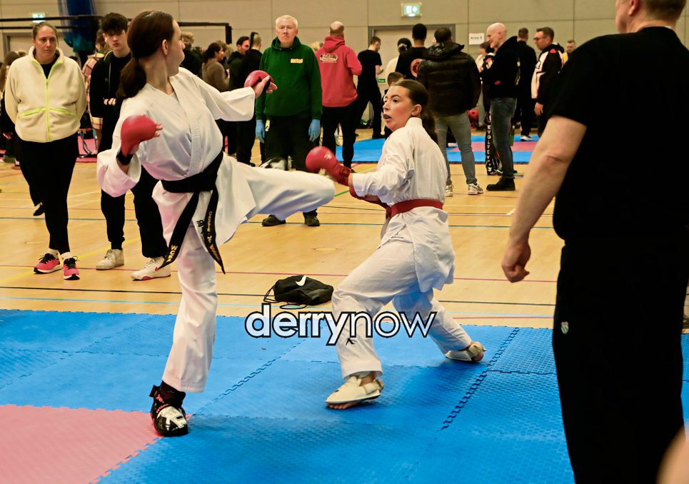 Zara Thompson (winner), NW Schotokan, defends herself against Cassie-Mai Woods from Wales in the WKU Open at Foyle Arena. (Photos - Tom Heaney, nwpresspics)