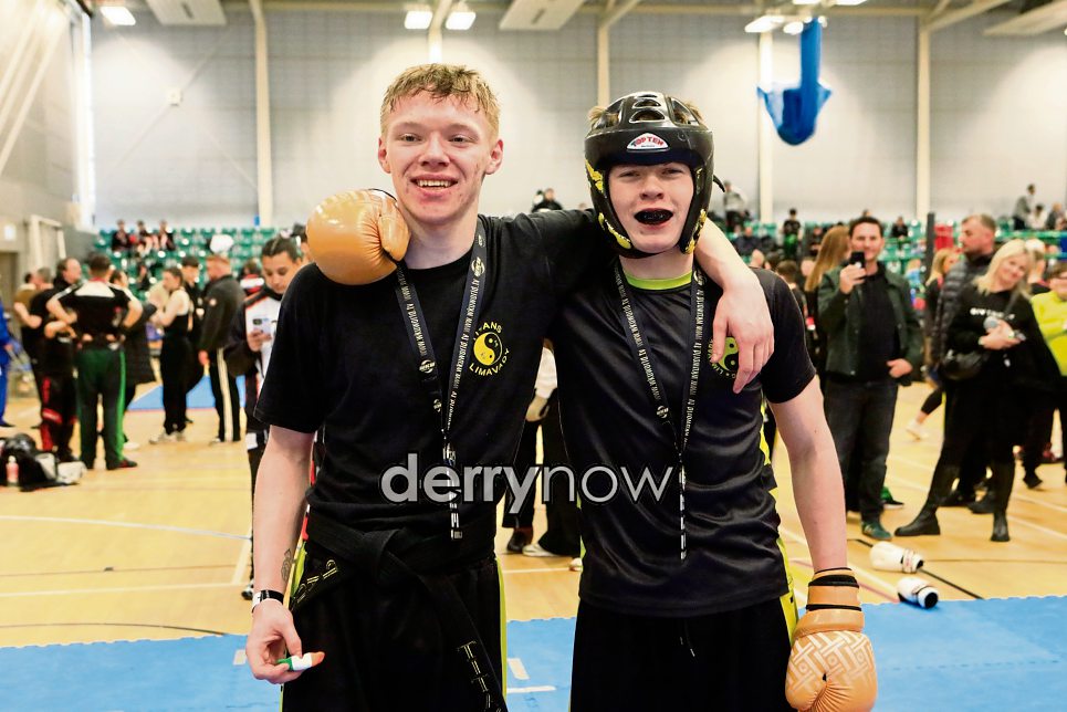 Ruairi Burns, 1st place, with Patrick Devine, runner-up in the PF36 Points Fighting Juniors 15-17 years at the WKU Open at Foyle Arena. (Photos - Tom Heaney, nwpresspics)