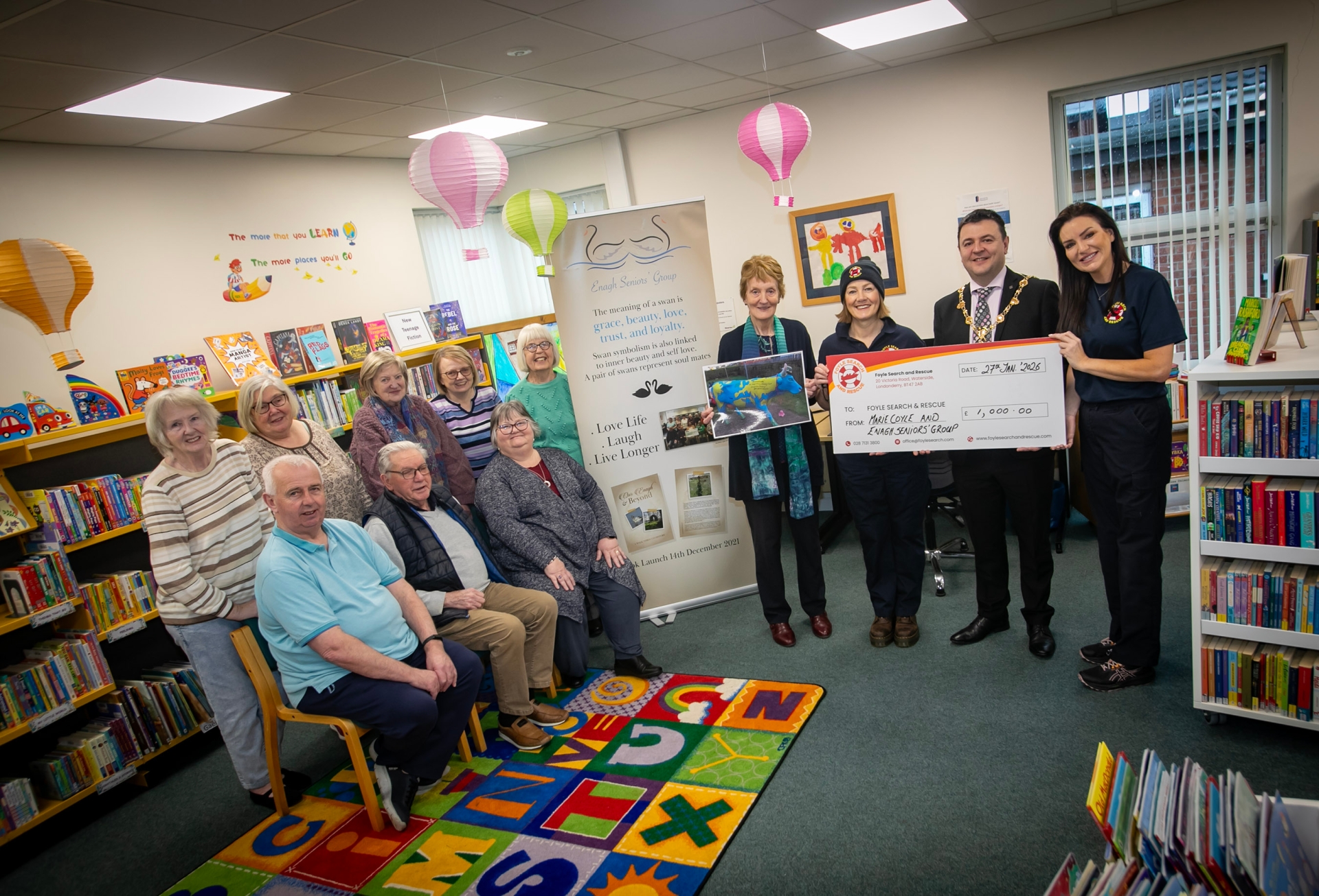 FS & R CHEQUE. . . . .Rachel McCarron and Kayla Mullan pictured at Strathfoyle Library on Tuesday morning receiving a cheque from the Elagh Seniors Group for £1,000, proceeds from the sale of the cow 'Ermitrude' at Lisahally Mart recently. Included on right are Marie Coyle and the Mayor, Ruairi McHugh, who presented the cheque. On left are members of Elagh Seniors Group. (Photos: Jim McCafferty Photography)