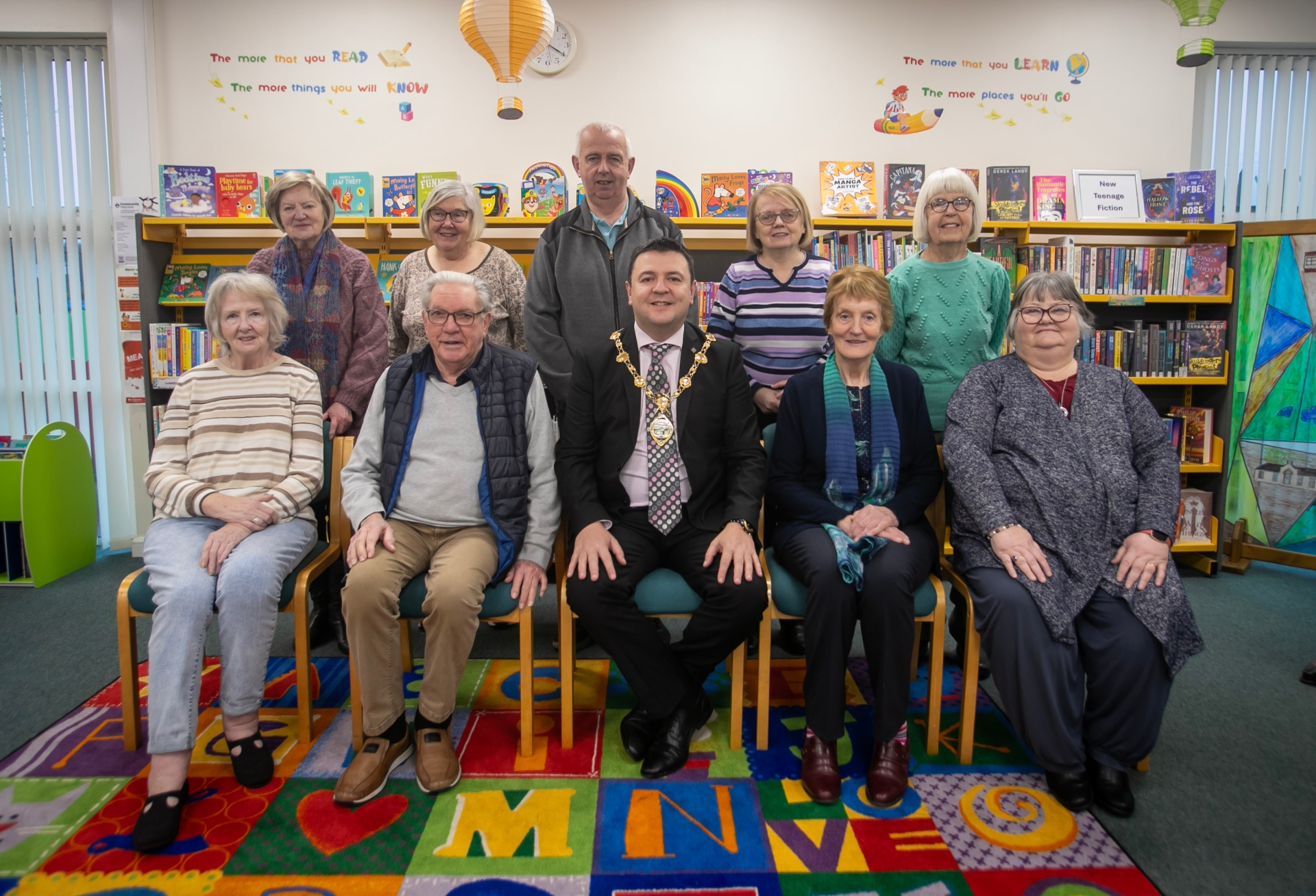 The Mayor of Derry City and Strabane District Council, Ruairi McHugh pictured with Enagh Seniors during a visit to their headquarters at Strathfoyle Library on Tuesday morning last.