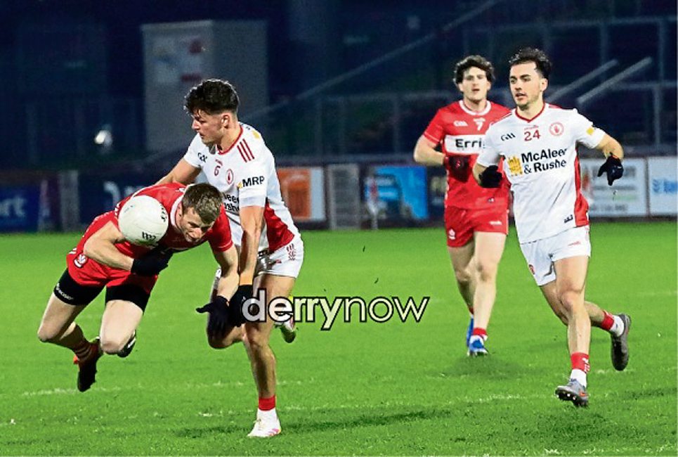 Derry’s Brendan Rogers takes a tumbleagainst Tyrone in the Allianz Football League Division II match between Derry and Tyrone at Celtic Park.