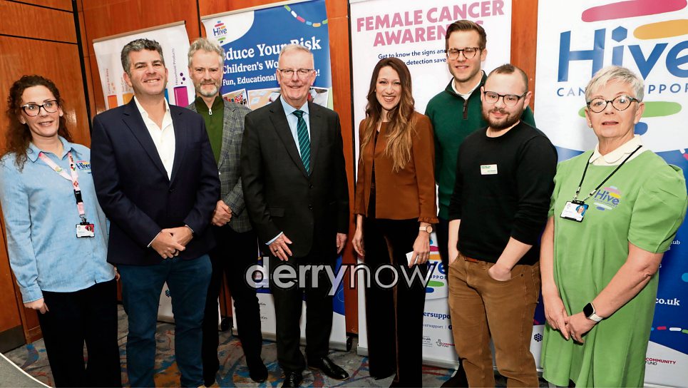 Minister for Health, Mike Nesbitt pictured with guest speakers and staff at the Hive Cancer Support Conference “World Cancer Day 20226 United by Unique” and held in the City Hotel. From left, are Michelle McLaren, Keith Berelowitz, pRxEngage, Prof. Joe O'Sullivan, Queen's University Belfast, and from right, Jacqui Loughrey, Joe Henson, Macmillan Cancer Support, Dan Middleton, Queen’s University, and Dr. Rosella Cannarella, HEAL.