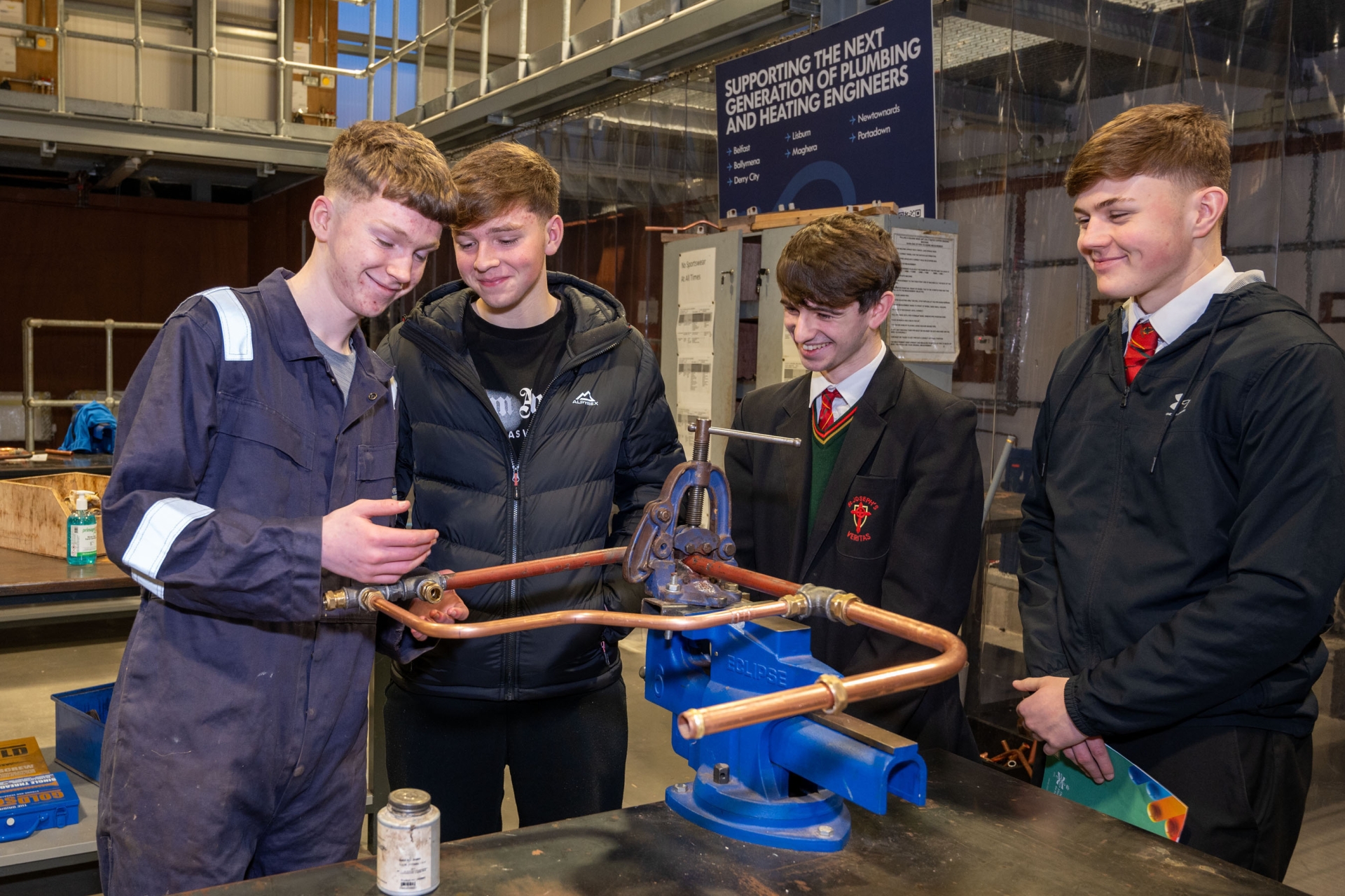 NWRC Student Oran Walker (left) profiles the College’s Plumbing workshops and activities to St Josephs Boys school pupils Niall Starrs, Oisin Frazer, and Keith Kelly at the college's Springtown Campus NI Apprentice Showcase as part of NI Apprenticeship Week.