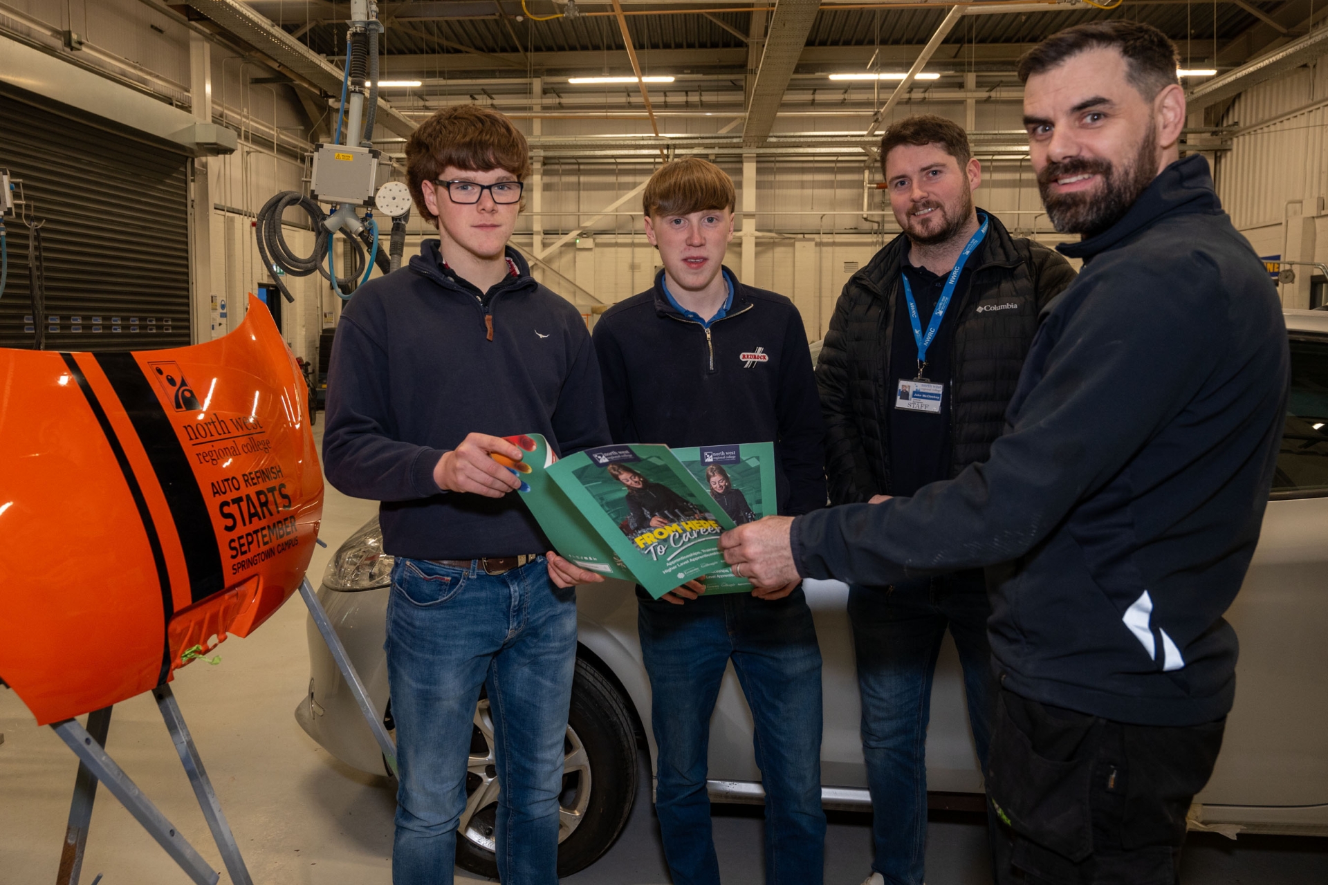 Corey Getty and Marley Evans, view the NWRC Motor Vehicle workshops in the company of Lecturers Jake McCloskey and Seamus Cassidy at the college's NI Apprentice Showcase as part of NI Apprenticeship Week. (Photos: Martin McKeown)