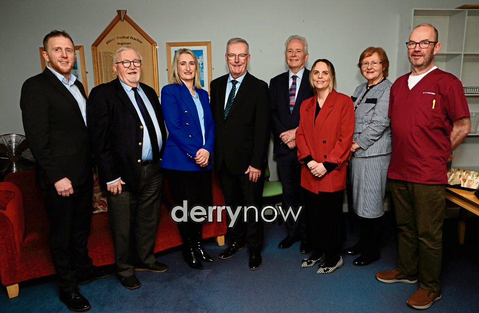 Group pictured with Minister for Health, Mike Nesbitt during a visit to Abbey Medical Practice, Abbey Street - Western Federation Support Unit, on Wednesday. Included, from left, are Geared Cassidy, director, Primary Care, Dr. Tom Frawley, chairman, Western Health and Social Care Trust, Maura O’Neill, Western Health and Social Care Trust, and from right, Dr. Brendan Rodgers, Bernie McCrory, non-executive director, Western Federation Support Unit, Rachel Forbes, chief officer, WFSU, and Dr. Tom Black, Abbey Medical Practice, Abbey Street, - Western Federation Support Unit.