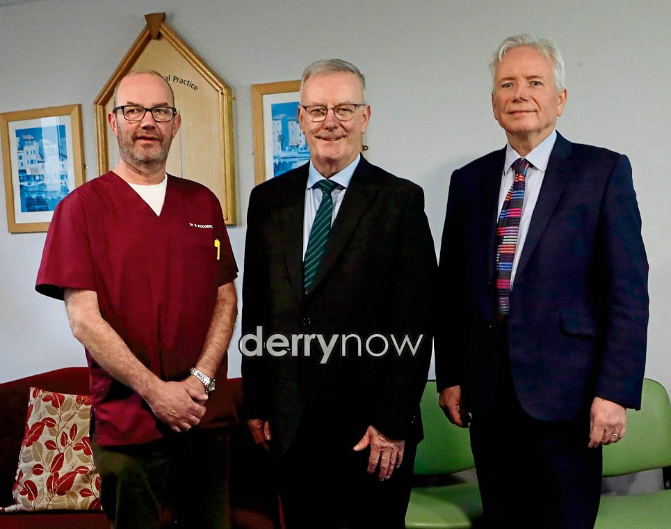 Minister for Health, Mike Nesbitt with Dr. Tom Black (on right) and Dr. Brendan Rodgers on his arrival at Abbey Medical Practice, Abbey Street - Western Federation Support Unit, on Wednesday. (Photos - Tom Heaney, nwpresspics)