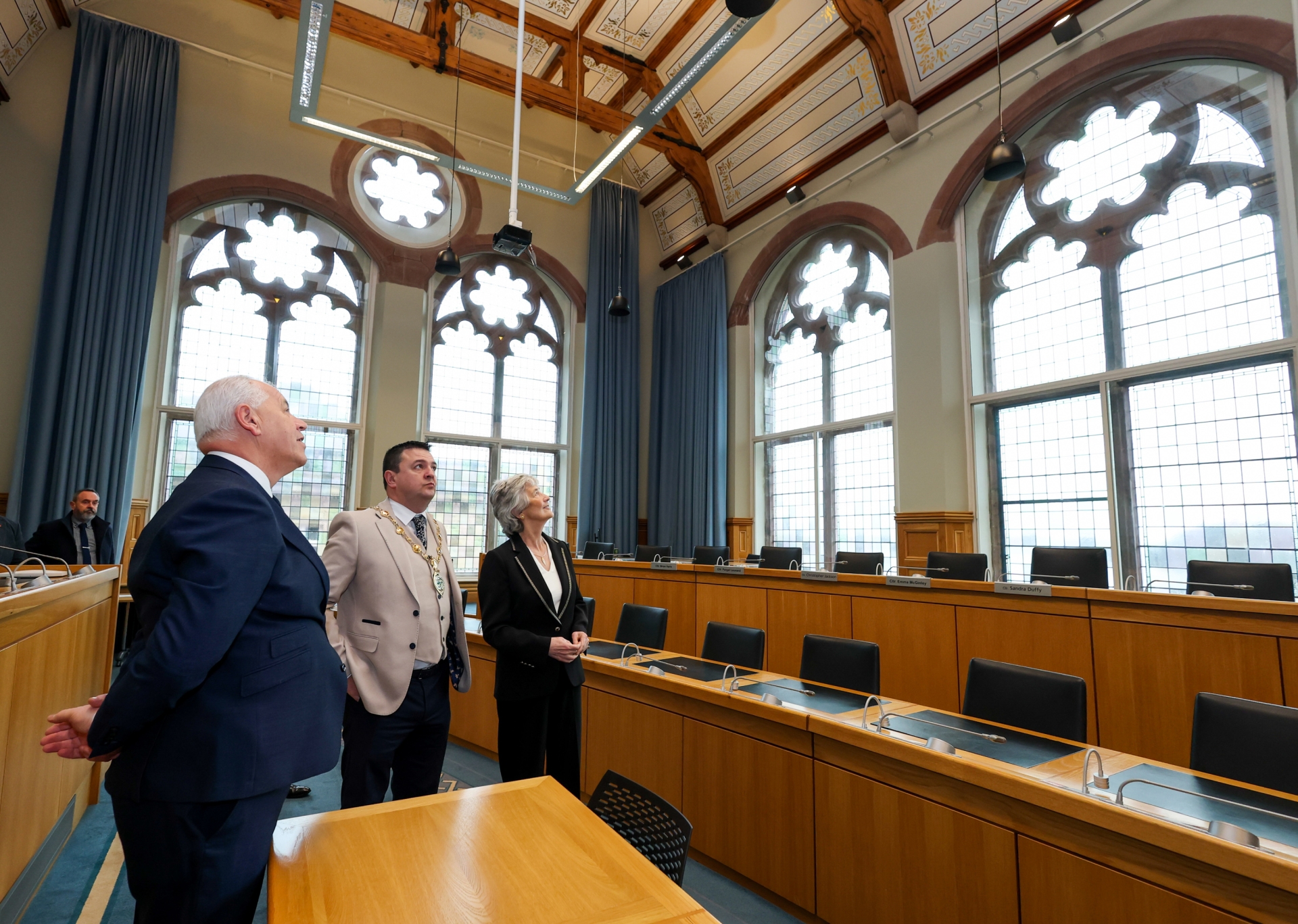 During the visit, the Mayor accompanied the President on an intimate tour of the iconic Guildhall, showcasing the building’s unique architecture and its central role in the history of the city, as well as an opportunity to view the John Hume Peace Medals.