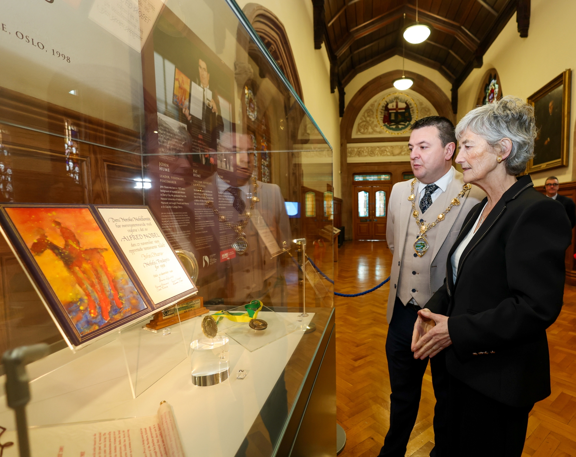 President Connolly views the Bloody Sunday alcove and the John Hume Peace Prize collection during her visit to Derry's Guildhall. (Photo: Tony Maxwell / Maxwells)