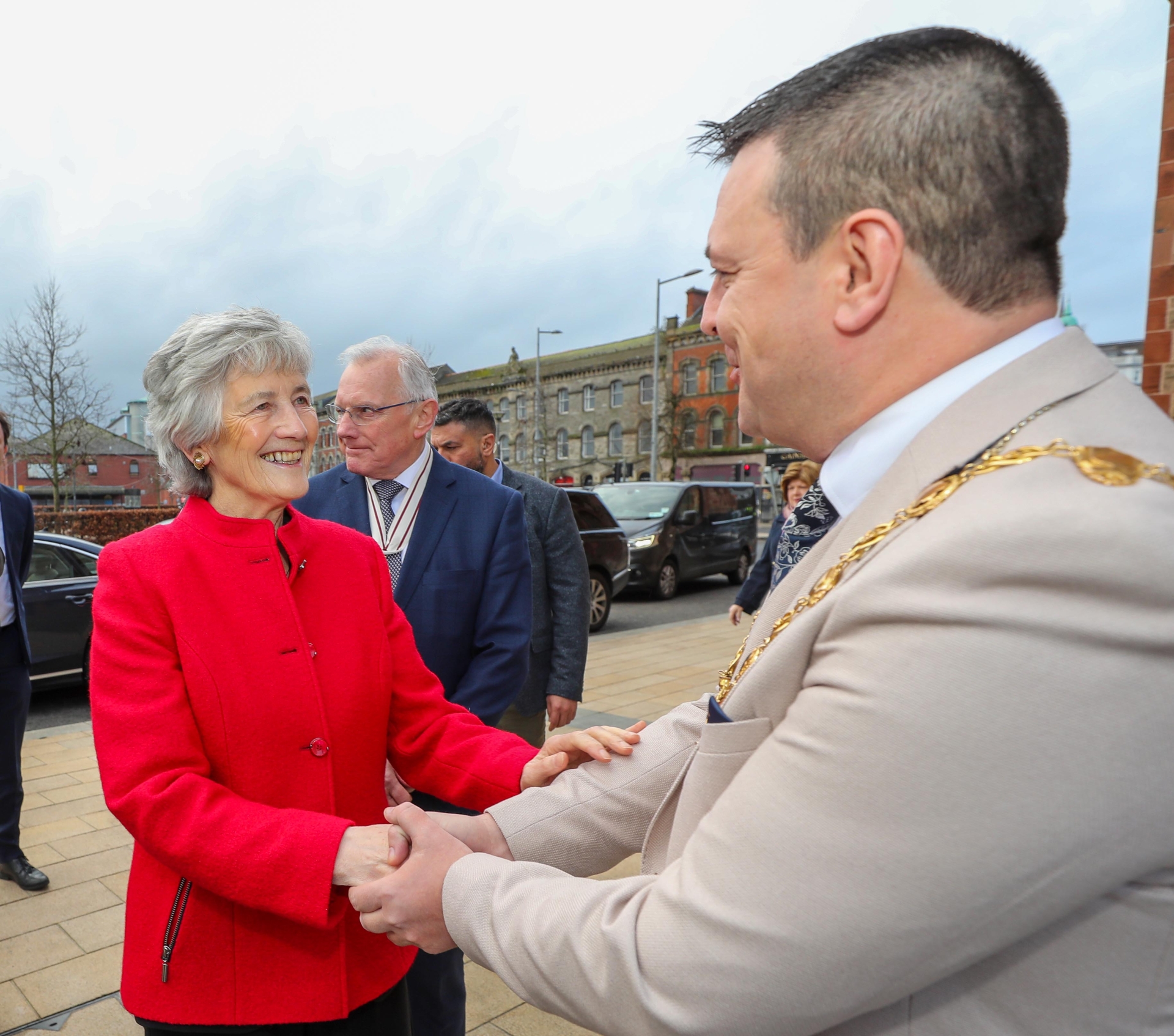 Mayor McHugh greets President Connolly on her arrival to the city. (Photo: Lorcan Doherty)