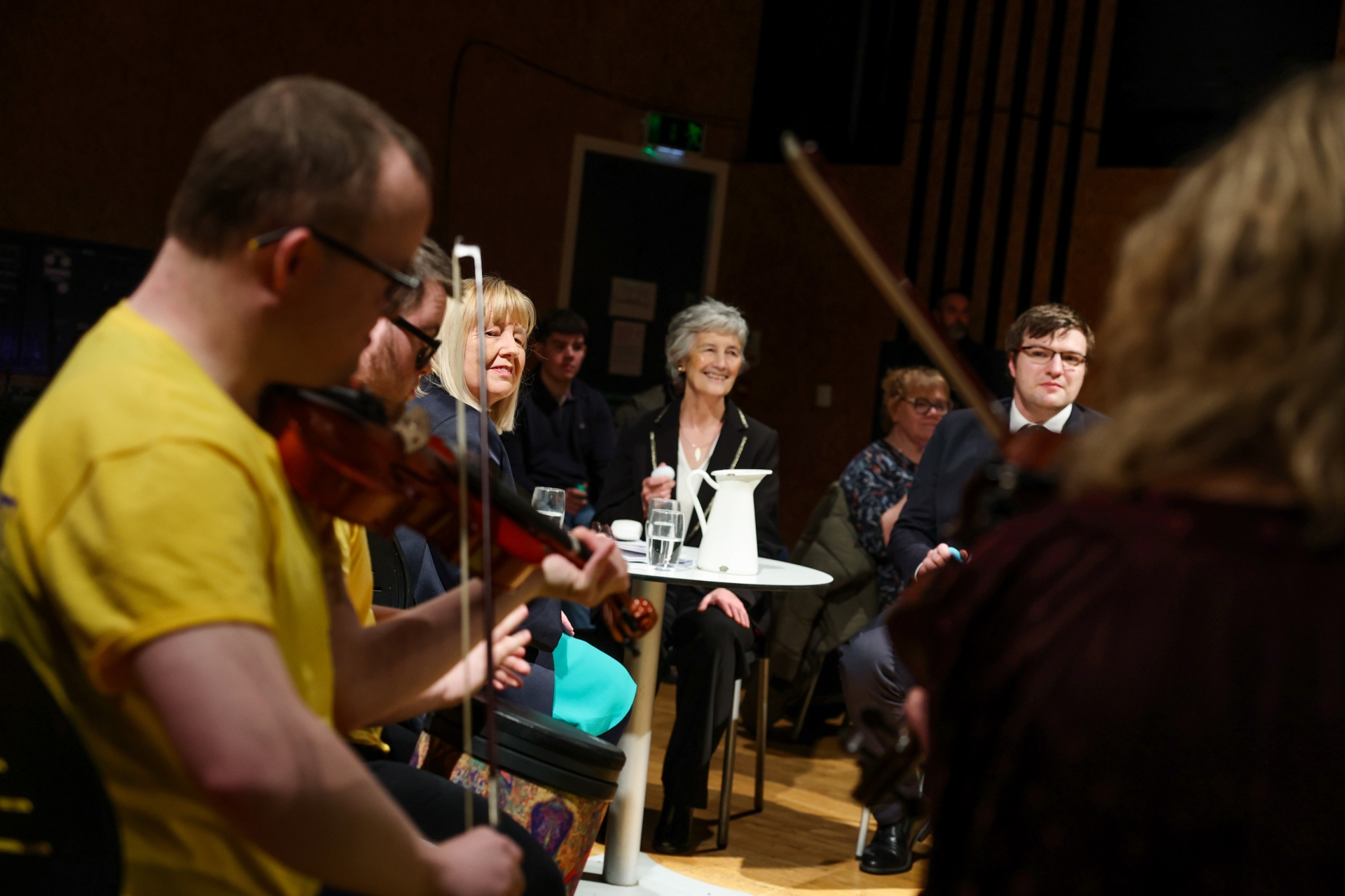 President Connolly at the place of culture, an Cultúrlann as she views a performance by young people who have special educational needs and disabilities, the workshop being hosted by Saoirsee Barbour who was awarded the Ashling Murphy Scholarship for Music Education. (Photos: Tony Maxwell / Maxwells)