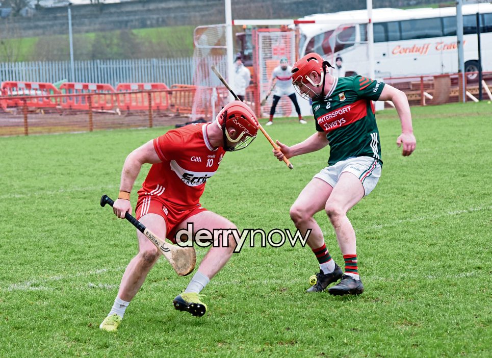 Derry's Michael Lynch challenges Mayo's Michael Gallagher.