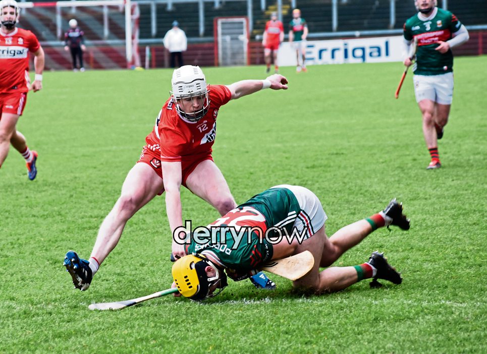 Derry's Darragh McGilliigan challenges David Kenny for possession.