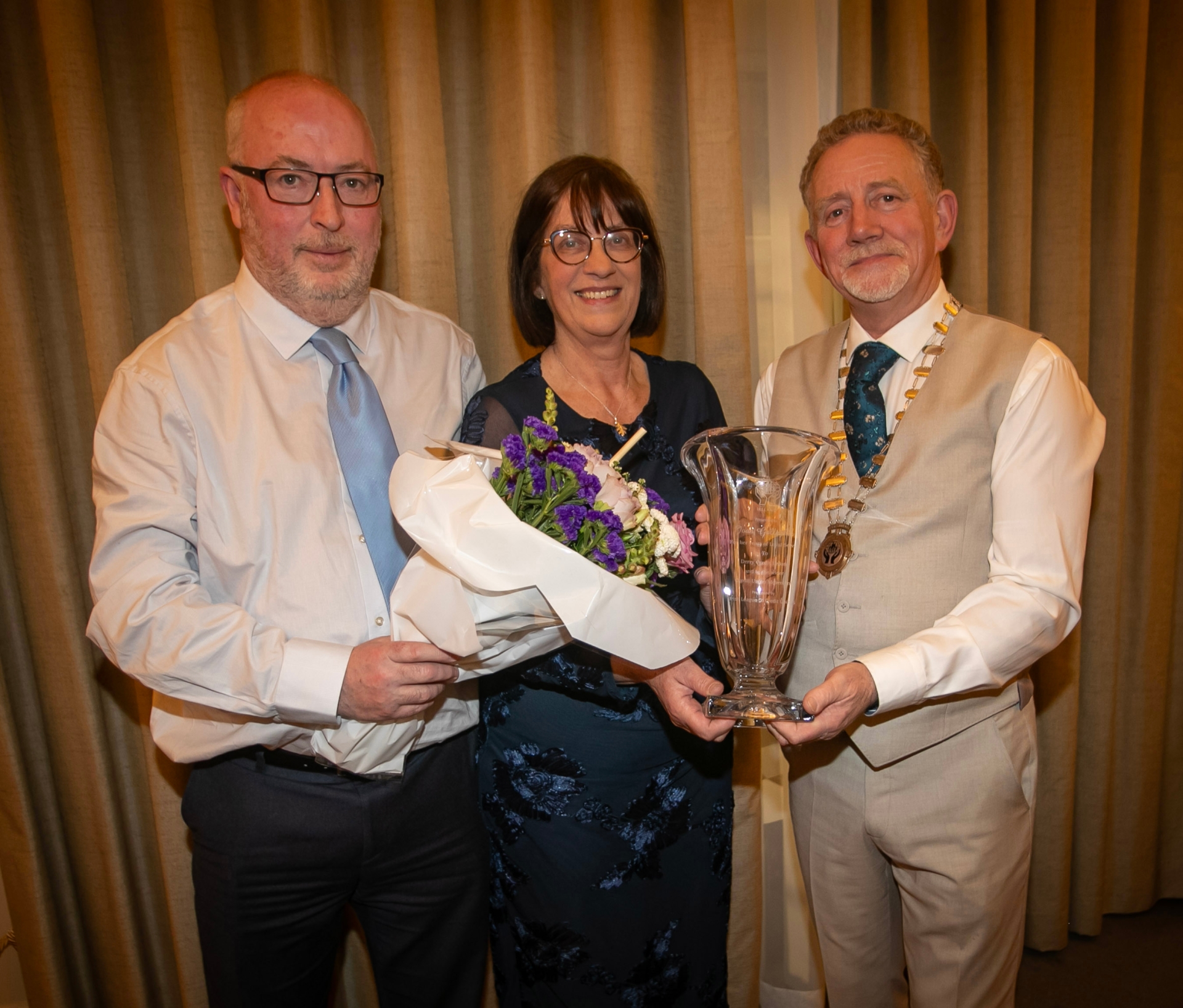 Rory Minto, ECCU and Brendan Jenkins, President, Irish League of Credit Unions, making a special presentation to Joan Gallagher at last Friday's function.