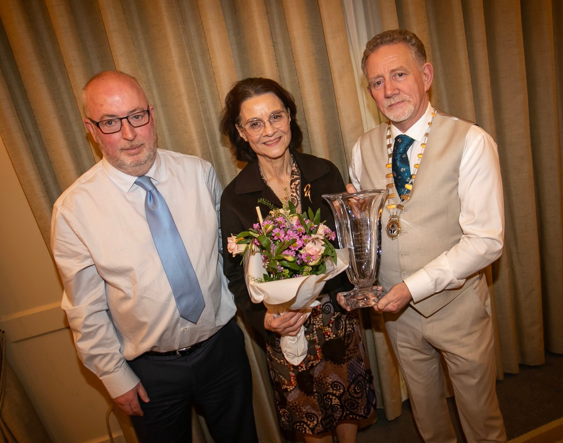 Rory Minto, ECCU and Brendan Jenkins, President, Irish League of Credit Unions, making a special presentation to Mary Crumley at last Friday's function. (Photos: Jim McCafferty Photography)