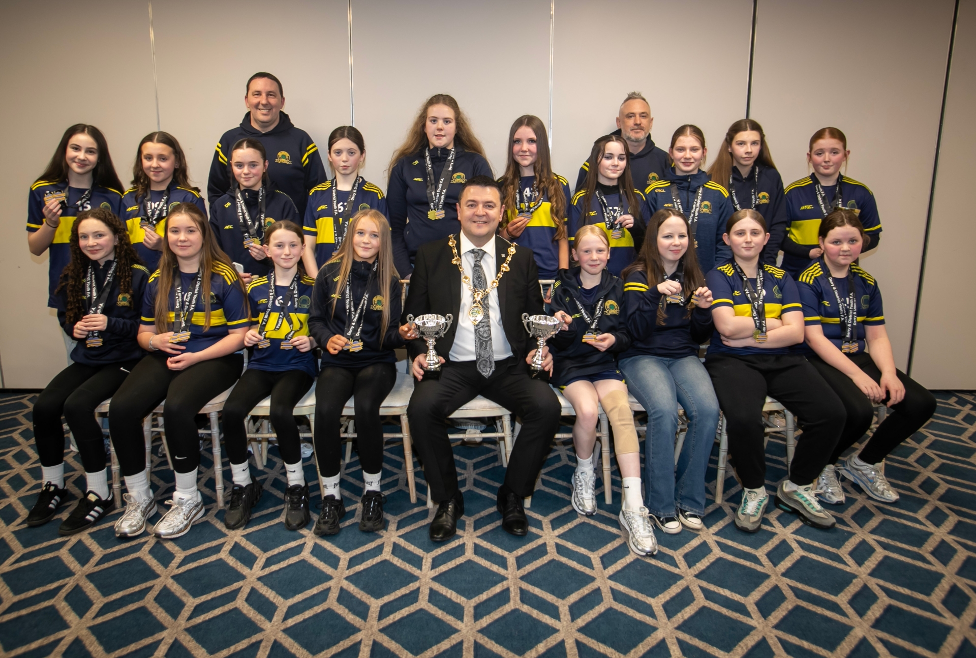 The Mayor, Ruairi McHugh pictured with Don Boscos Girls u-12s, League Champions and Winter Cup winners, at the D&D Ladies Awards on Friday night. Included are coaches Brian McCay and Shaun Kelly. (Photos: Jim McCafferty Photography)