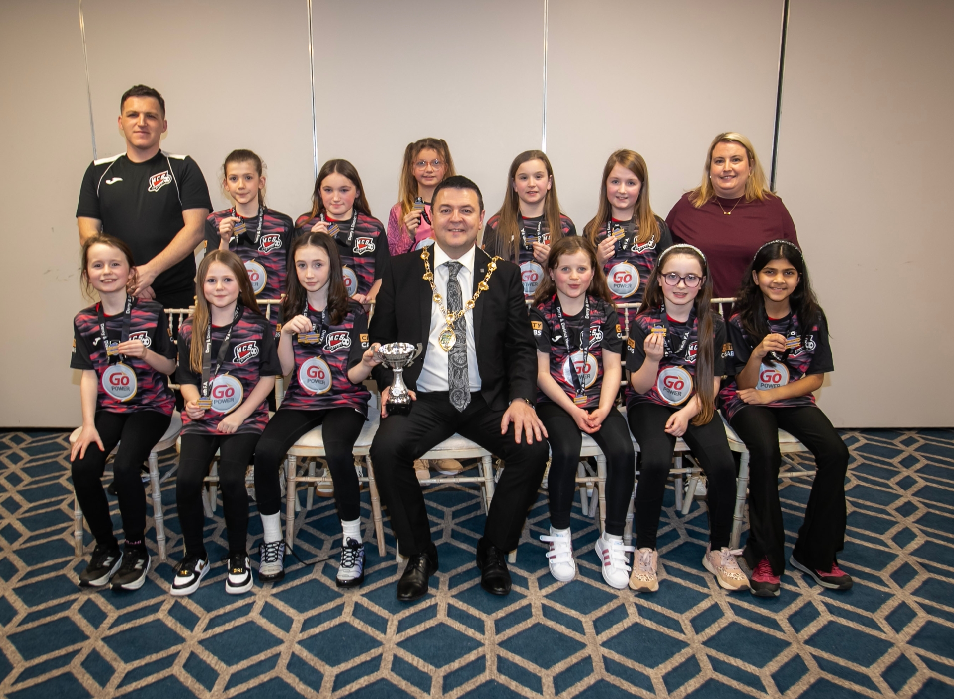 The Mayor, Ruairi McHugh pictured with Maiden City Girls u-10s, League Champions and Winter Cup winners, at the D&D Ladies Awards on Friday night. Included are coaches Gary Porter and Rachel Mark. (Photos: Jim McCafferty Photography)