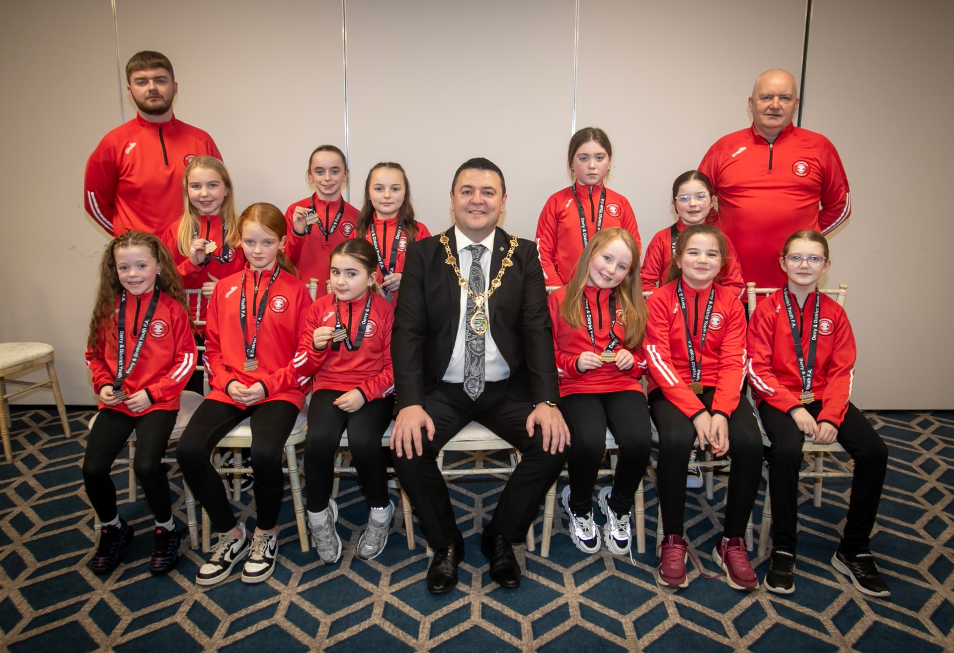 The Mayor, Ruairi McHugh pictured with Tristar u-10s, runners up in the Winter Cup at the D&D Ladies Awards on Friday night. Included are coaches Shaun Conden and Caolan Conden.