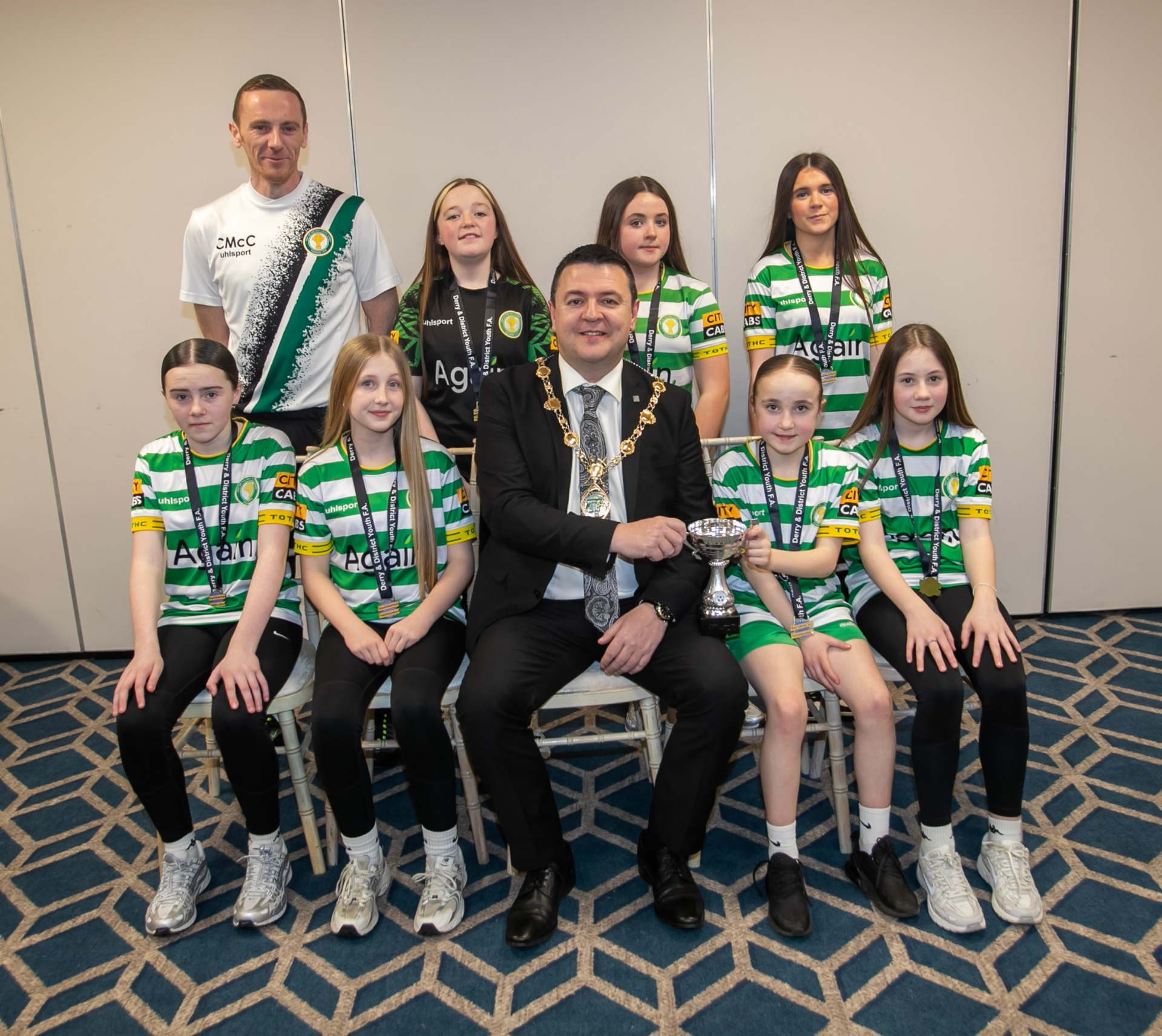 The Mayor, Ruairi McHugh pictured with Top of the Hill Celtic Girls u-13s, Winter Cup winners, at the D&D Ladies Awards on Friday night. Included is coach Ciaran McCloskey.