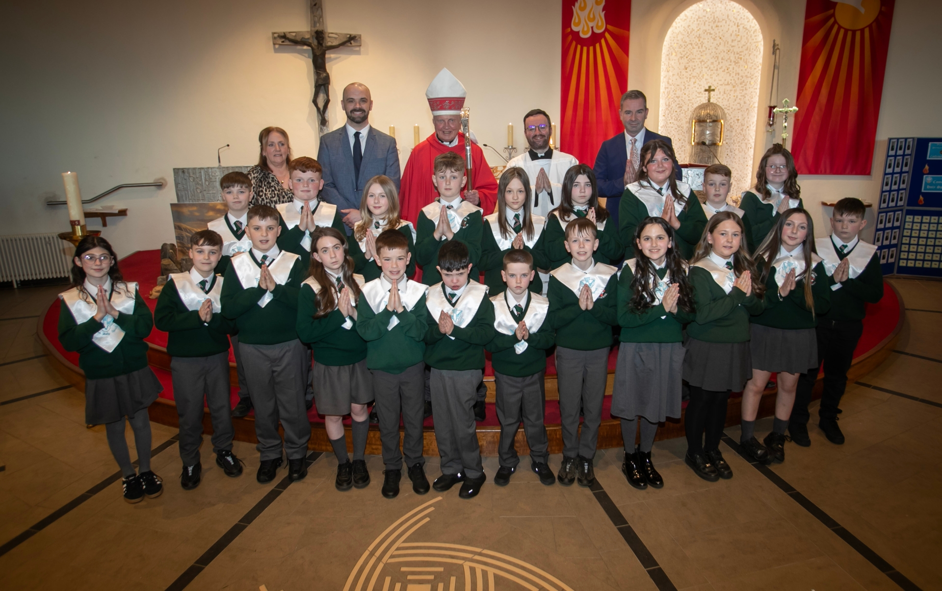 Mr. Kevin Smith's class at Greenhaw Primary School who received the Sacrament of Confirmation from Bishop Donal McKeown at St. Brigid's Church, Carnhill. Included at back are Mrs Wilson, Mr. Kevin Smith, Fr. Stephen Ward and Mr. Shaun McLaughlin, Principal. (Photo: Jim McCafferty Photography)