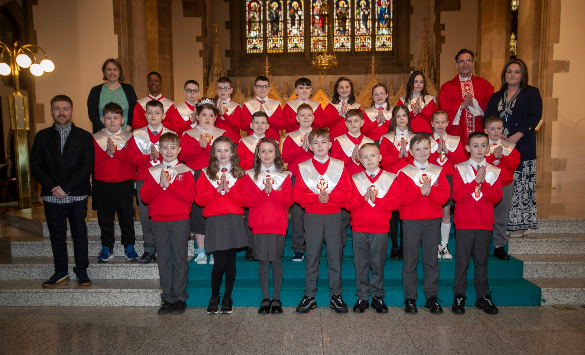 Pupils from St. Eugene's Primary School who received the Sacrament of Confirmation from Fr. Shaun Doherty at St. Eugene's Cathedral. Included in photo are Mrs Áine Deane, Vice Principal, Ms Ciara Herron, teacher and Mr Conall McElhinney, Classroom Assistant. (Photo: Jim McCafferty Photography)
