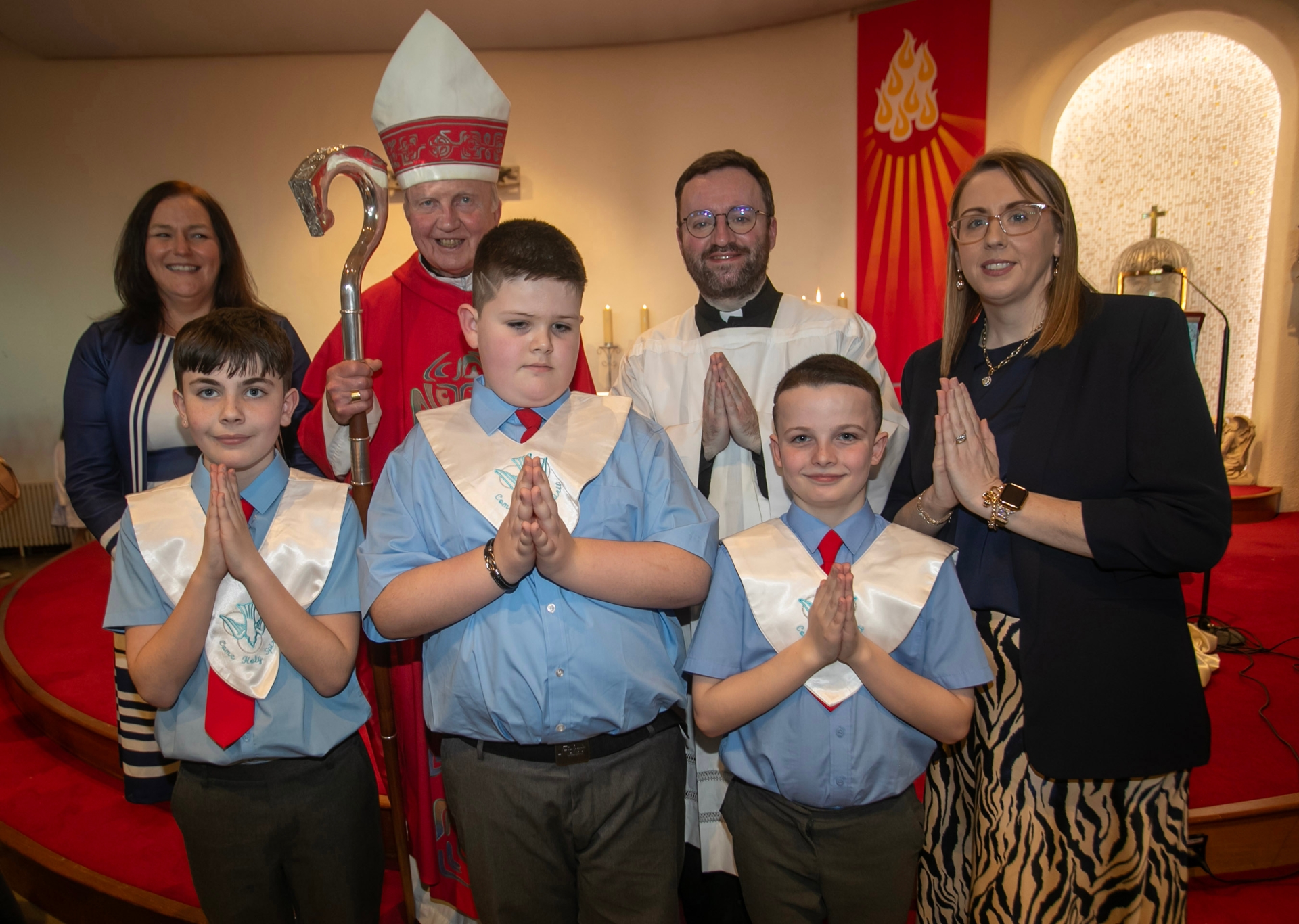 Pupils from St. Brigid's Primary School who received the Sacrament of Confirmation from Bishop Donal McKeown at St. Brigid's Church, Carnhill. At back are Mrs. Caroline Callan, Principal, Fr. Stephen Ward and Mrs. Danielle McLaughlin, teacher. (Photo: Jim McCafferty Photography)