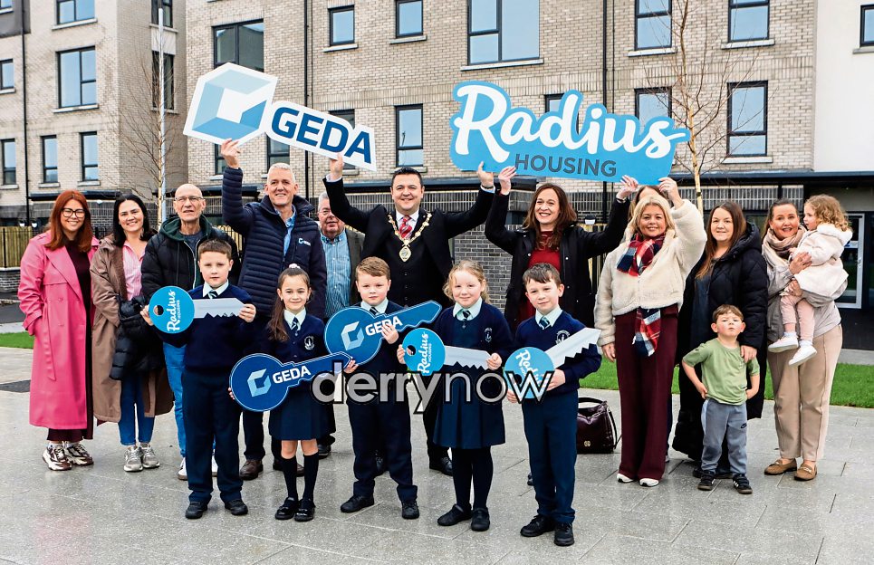 Mayor Ruairí McHugh at the official open the new Radius / Geda social housing development “Daisyfield Court”, Foyle Road, with Denise Quinn, senior head of development, Radius Housing and Damian Murray, construction partner Geda. Also included are Clare Doherty, principal, parents and pupils from Longtower PS. (Photos - Tom Heaney, nwpresspics)