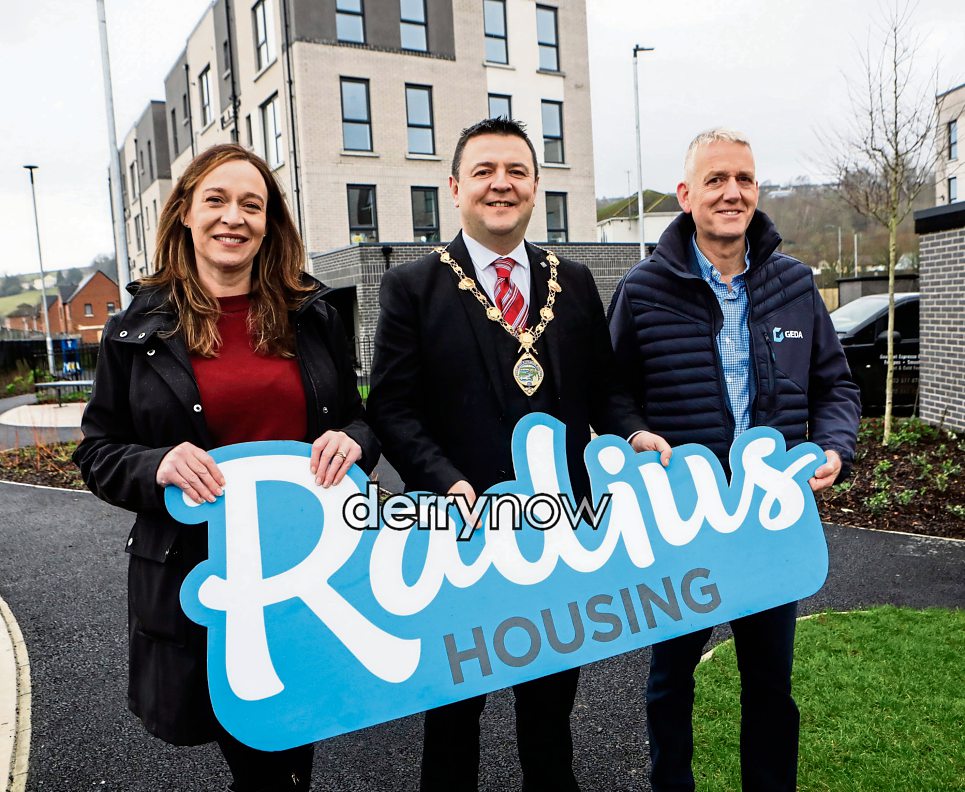 Mayor Ruairí McHugh at the official opening of the new Radius / Geda social housing development “Daisyfield Court”, Foyle Road, with Denise Quinn, senior head of development, Radius Housing and Damian Murray, construction partner Geda.