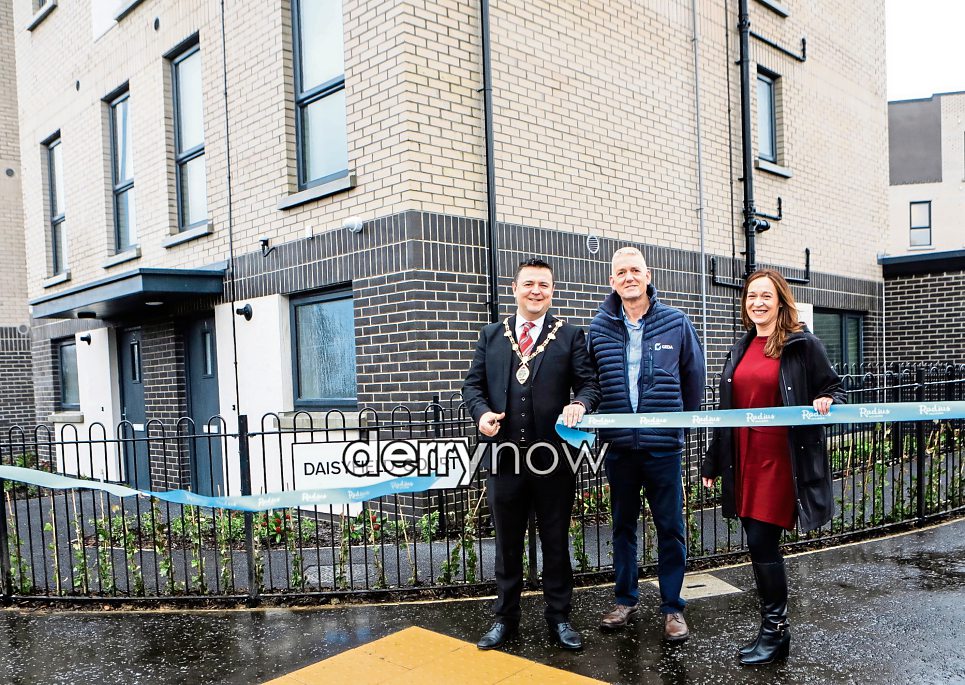 Mayor Ruairí McHugh cutting the ribbon to officially open the new Radius / Geda social housing development “Daisyfield Court”, Foyle Road. Included are Denise Quinn, senior head of development, Radius Housing and Damian Murray, construction partner Geda. (Photos - Tom Heaney, nwpresspics)