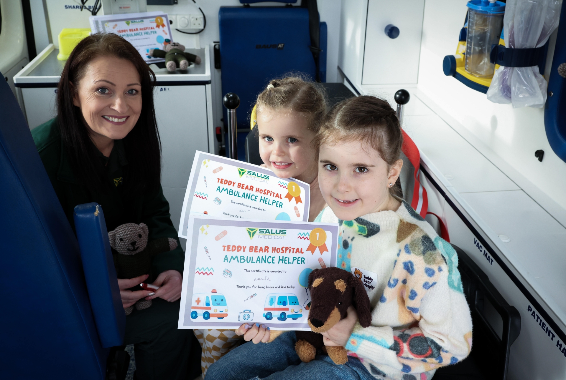 Emi and Amelia Gilland with Paramedic Kate O’Neill at the Teddy Bear Hospital event.