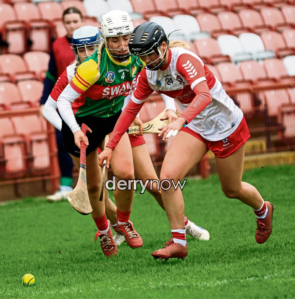 Derry camogie Lauren McKenna in a battle for possession.
