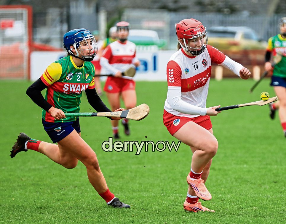 Derry camogie Carla Collins collects the sliotar as Carlow’s Niamh Canavan moves in. (Photos - Tom Heaney, nwpresspics)