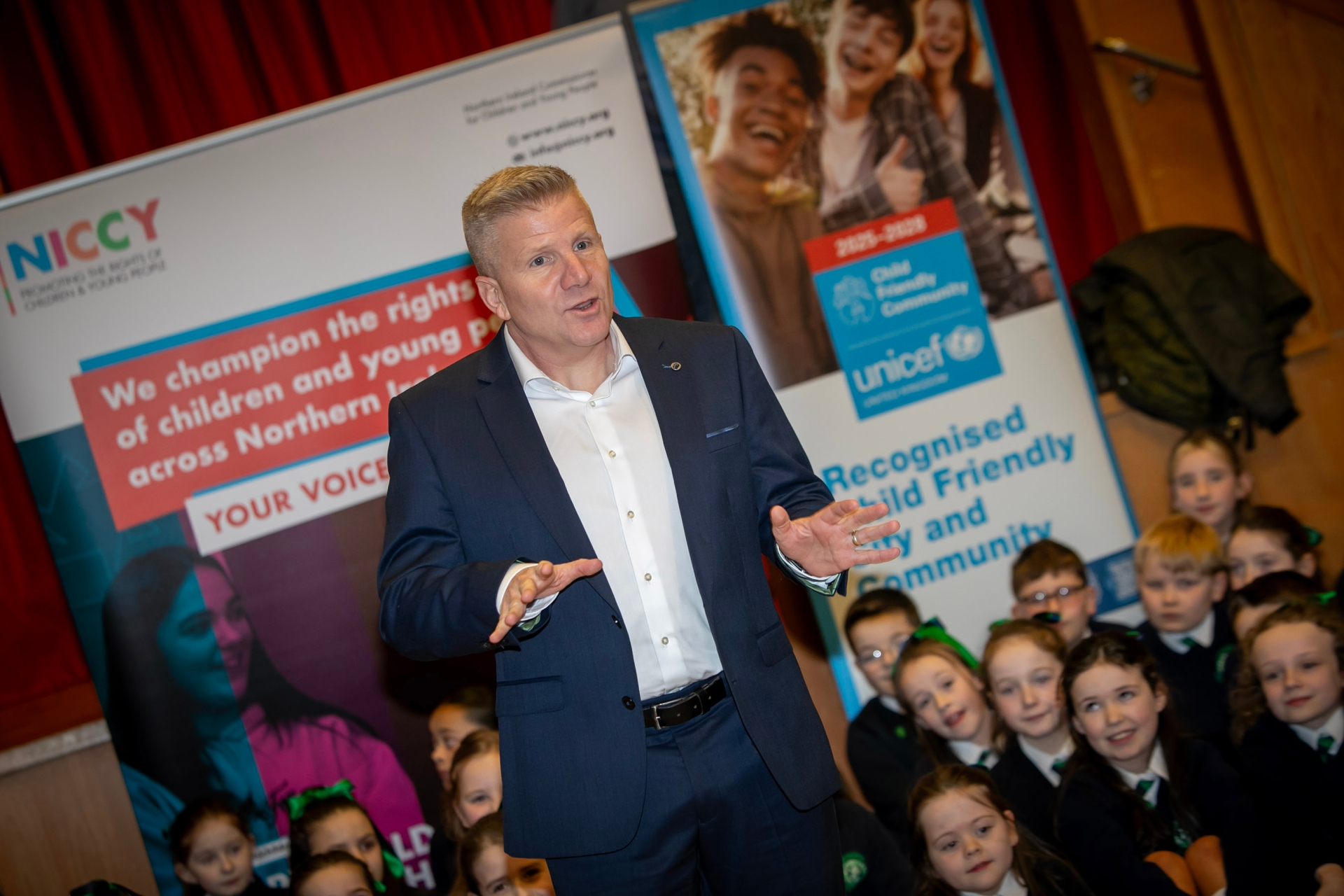 Children's Commissioner Chris Quinn addressing the children at Wednesday's launch in St. Patrick's Primary School, Pennyburn, Derry. (Photos: Jim McCafferty Photography)