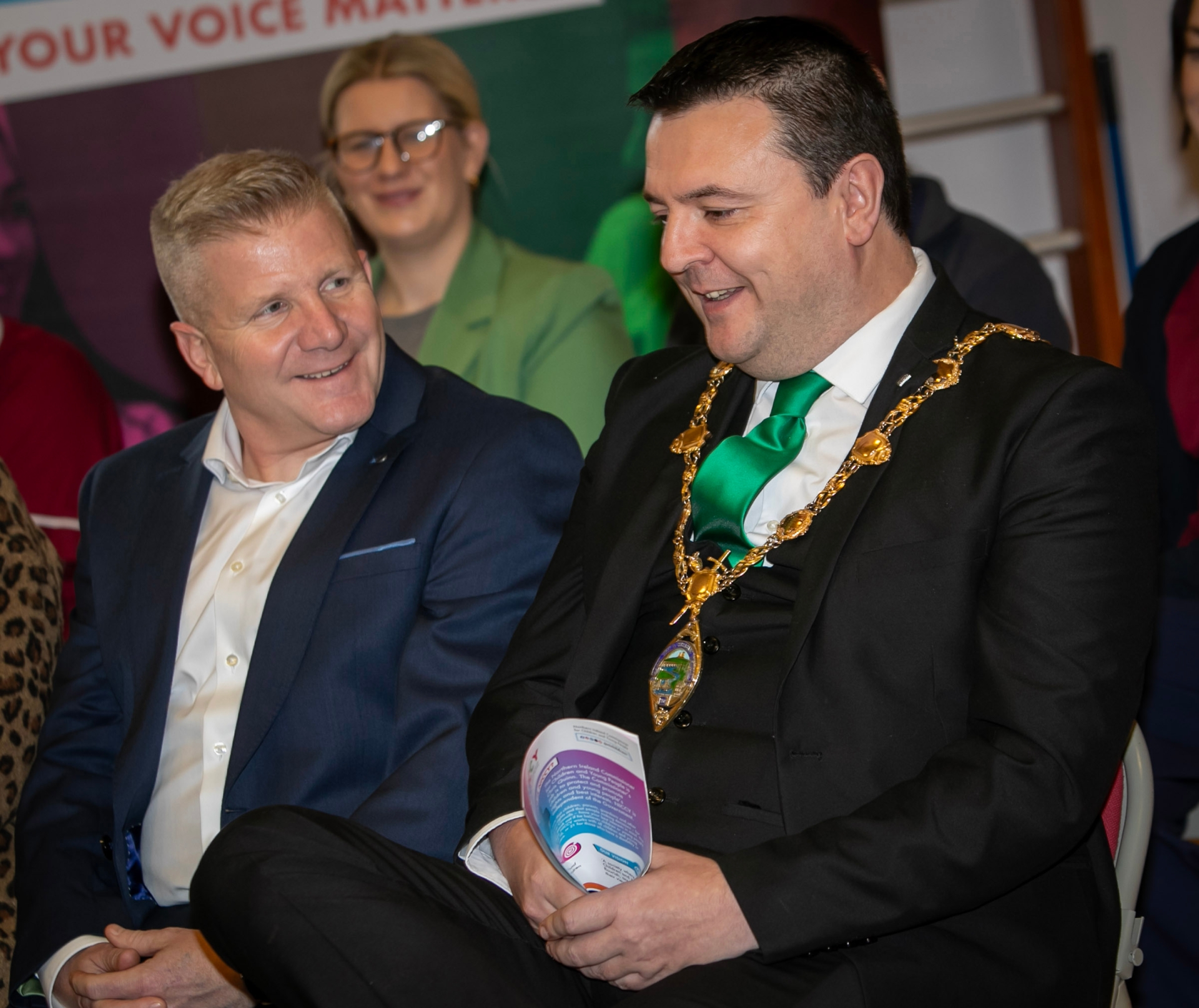 Children's Commissioner Chris Quinn and the Mayor, Ruairi McHugh in conversation during Wednesday's launch in St. Patrick's Primary School, Pennyburn, Derry.