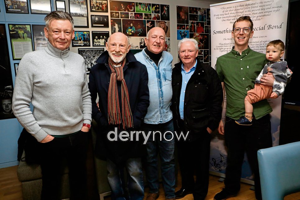 Group pictured at the Showband reunion held in the Maldron Hotel. From left, are Willie Coyle, Francis Canning, Harry McGilloway, Mickey Feeney, John Layton with his son Alex. (Photos - Tom Heaney, nwpresspics)