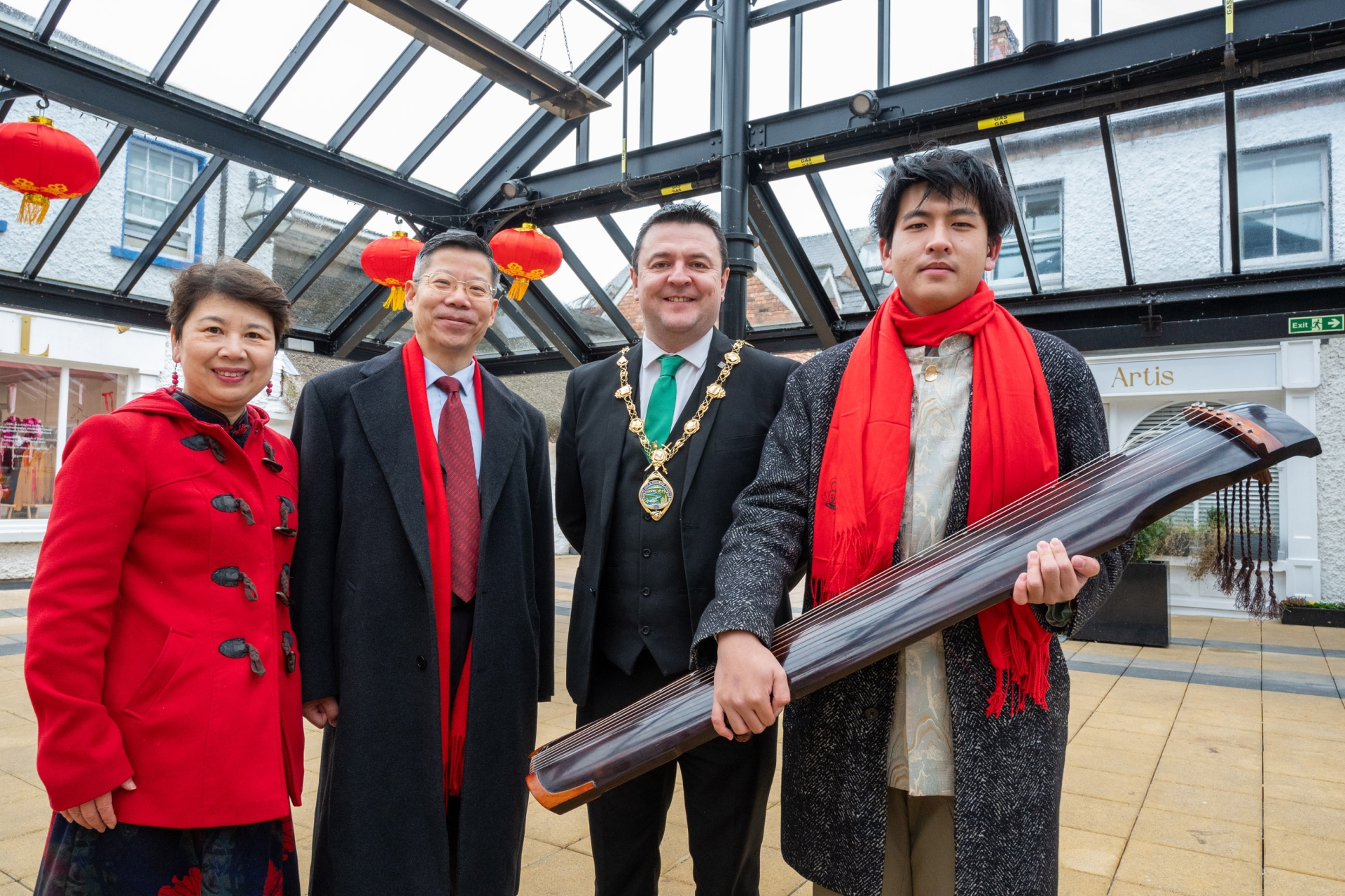 The Mayor of Derry City and Strabane District Council, Councillor Ruairi McHugh, welcomed Chinese Consul Li Nan, second from left and Yang Zhou, Mandarin Speakers Association, to the Inner City Trust’s Craft Village where Chinese Lanterns have been placed to mark the Chinese Lunar New Year and the beginning of the Year of The Fire Horse. Included, right, is Zuoboyao who performed with his traditional Guqin. (Photos: Martin McKeown)