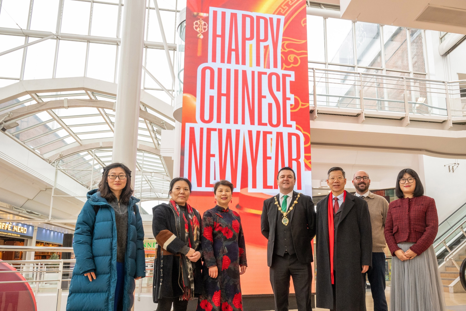 The Mayor Councillor Ruairi McHugh welcomed Chinese Consul Li Nan to the Inner City Trust’s Craft Village where Chinese Lanterns have been placed to mark the beginning of the Year of The Fire Horse. They also visited Foyleside Shopping Centre where manager Paul Doherty took them to view the electronic display marking the occasion and the Lanterns which have been placed at the upper entrance to the centre.