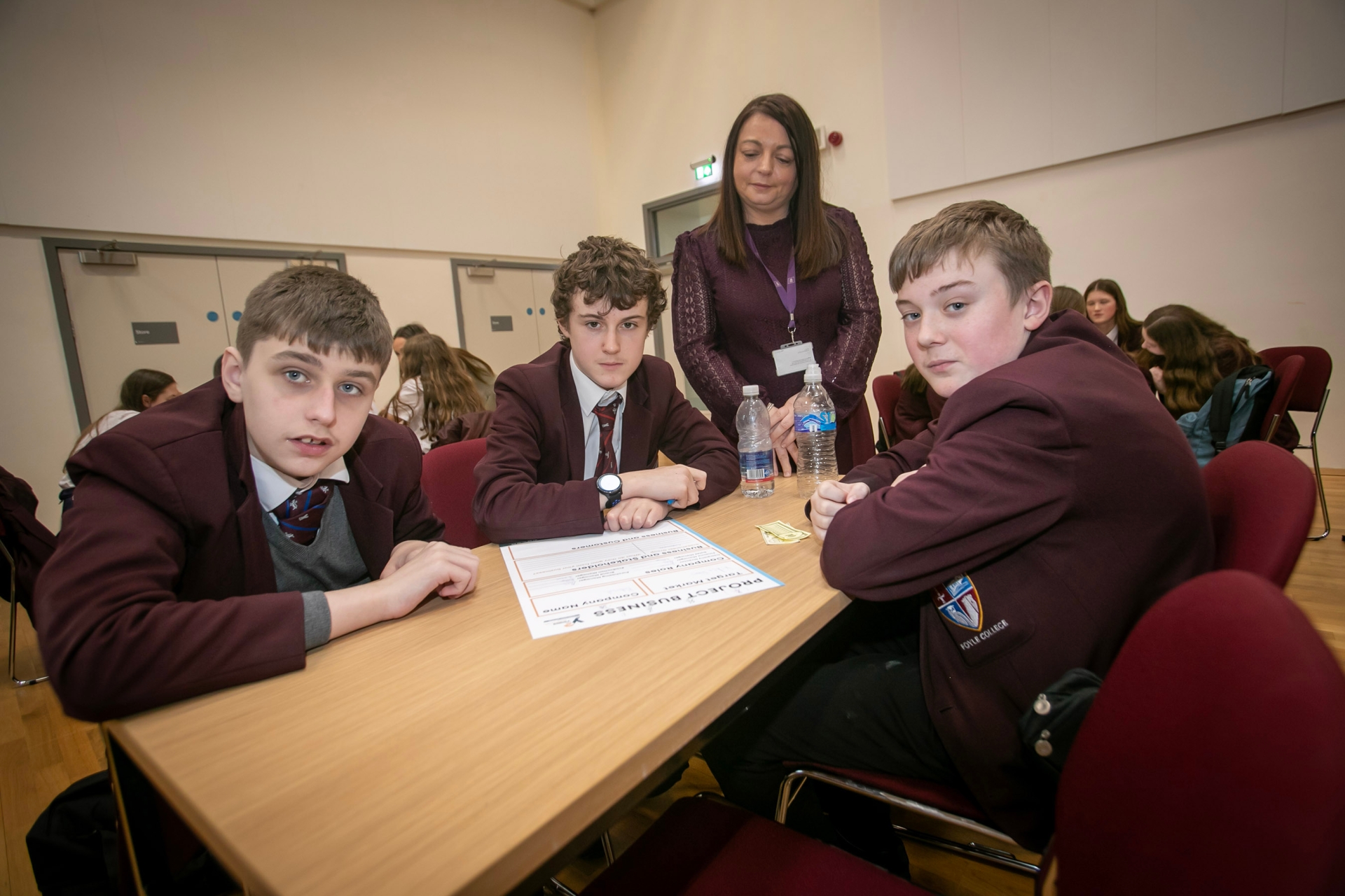 Allied Irish Bank's Stephanie Carson pictured helping out Foyle College students Bobby Ogilby, Alex Given and Isaac Bradley.