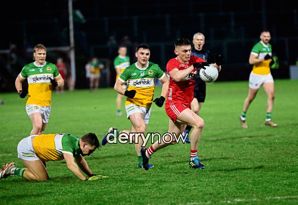 Derry’s Matthew Downey makes a break with the ball before going on to score a goal against Offaly on Saturday night at Celtic Park.