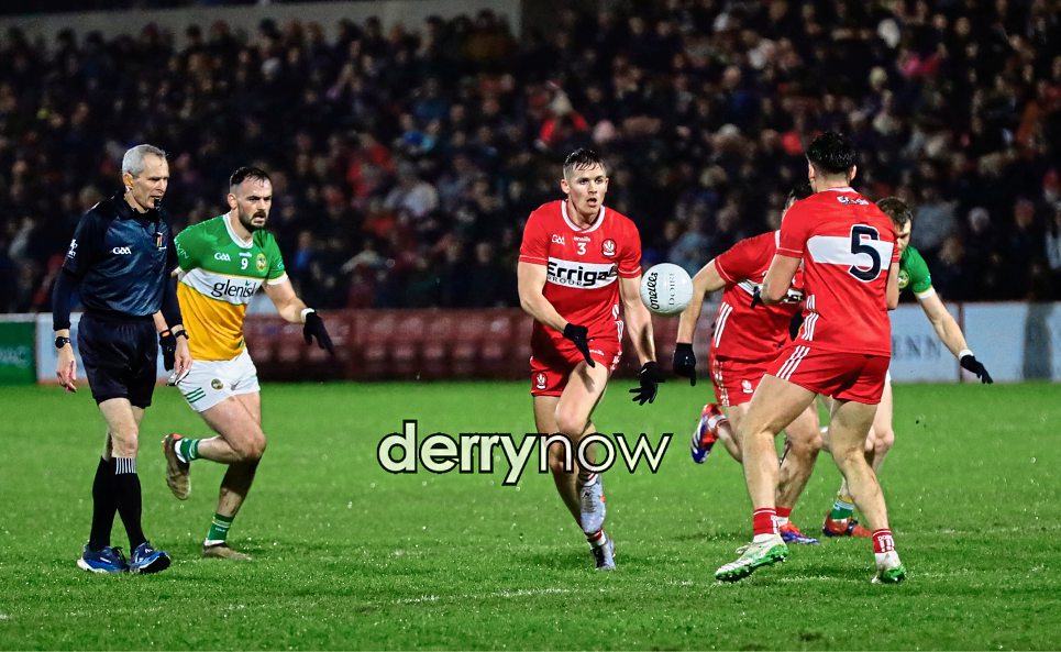 Derry’s Ruairi Forbes passes the ball to Conor Doherty.