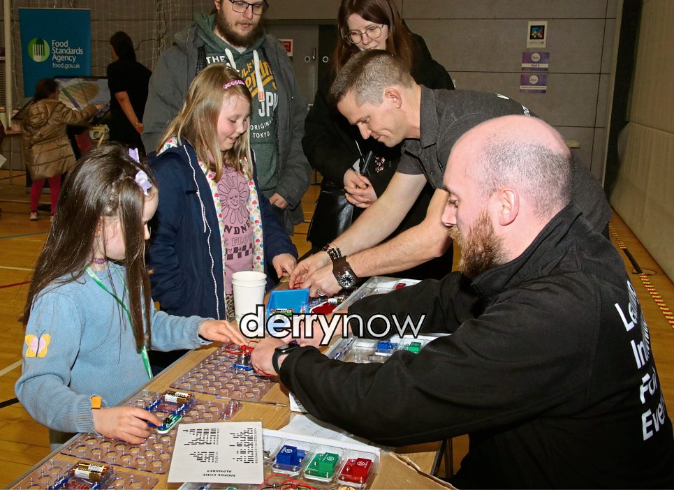 Michael from W5 with children and parents at The Foyle Science Showcase.