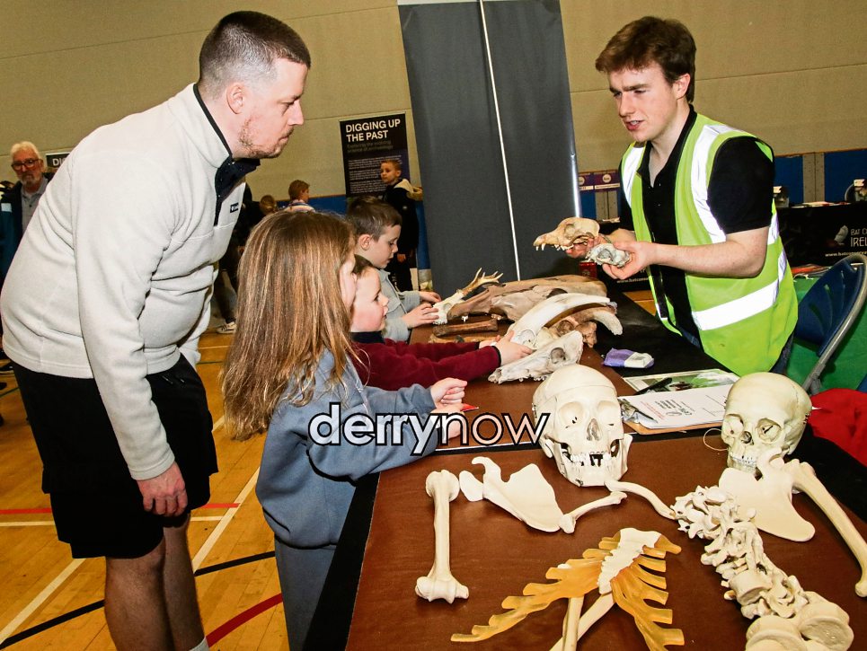 Brody McEvoy from CAPNI, with Evie and Charlie and their dad checking out skelton bones.