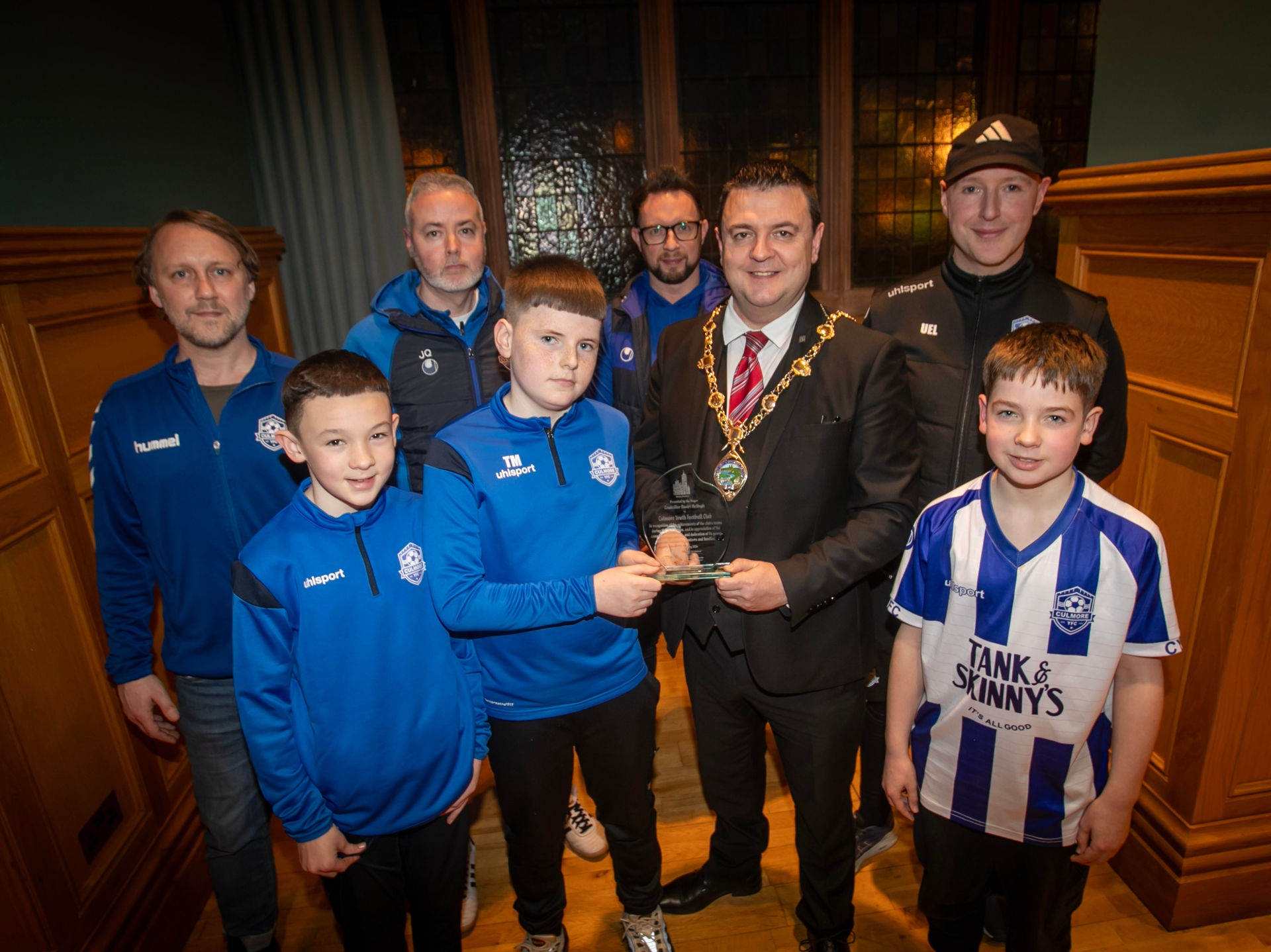 MAYORAL RECEPTION FOR CULMORE FC YOUTHS. . . . .The Mayor of Derry City and Strabane District Council, Ruairi McHugh making a special presentation to Culmore Youth FC captain Thomas Myers at a reception in the Whittaker Suite, Guildhall on Tuesday evening. Included at front are joint captains Georgie Long and Aodhan McHenry. At back from left are club coaches Dan Turner, Jay Quinn, Mark Hanna and Uel Watson. (Photos: Jim McCafferty Photography)