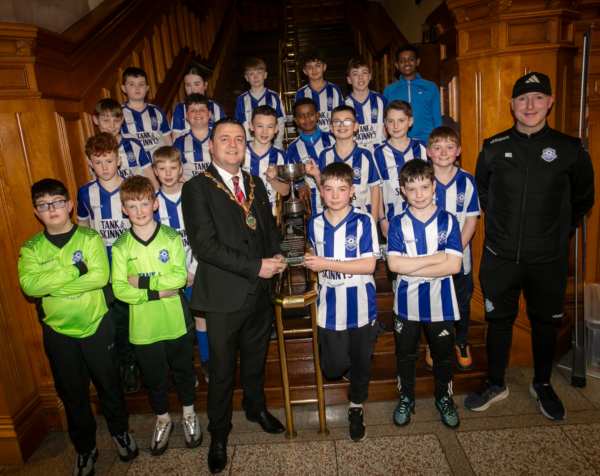 The Culmore Youth FC under-12 squad receiving a special presentation from the Mayor, Ruriari McHugh at the Guildhall on Tuesday evening. The presentation marked the achievements of the club's teams during the 2025 season and in appreciation of the commitment, teamwork and dedication of its young players, coaches, volunteers and families.